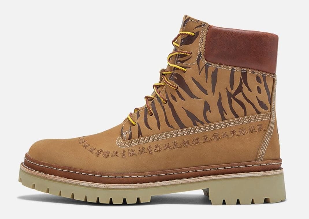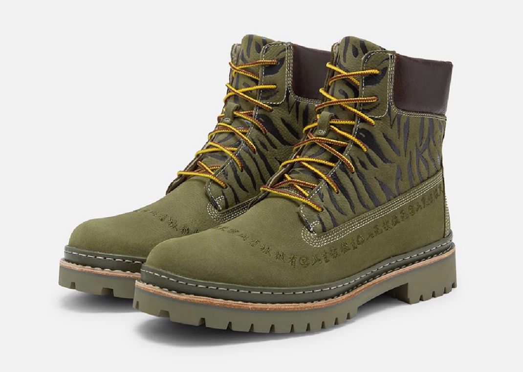 Following up on the duo's first collaboration on the 3-Eye Lug, CLOT and Timberland’s two takes on the 6-Inch Boot include a tonal “Olive” colorway and a rework on the classic “Wheat” iteration. For the former of the two colorways, we see an olive tumbled leather take over the model with Chinese characters embroidered and encircling the upper. Tiger stripe patterns are stamped atop the tongue and portions of the midfoot in a black hue. Other contrasting hits include the brown leather around the collar, the two-tone yellow/brown on the lace set, and the white stitching details. A similar build is utilized for the second colorway, “Wheat,” with the only difference being the shades used across the upper. Rounding out the look for both colors is the iconic 6-Inch Boot’s sole unit in a tonal shade of green.