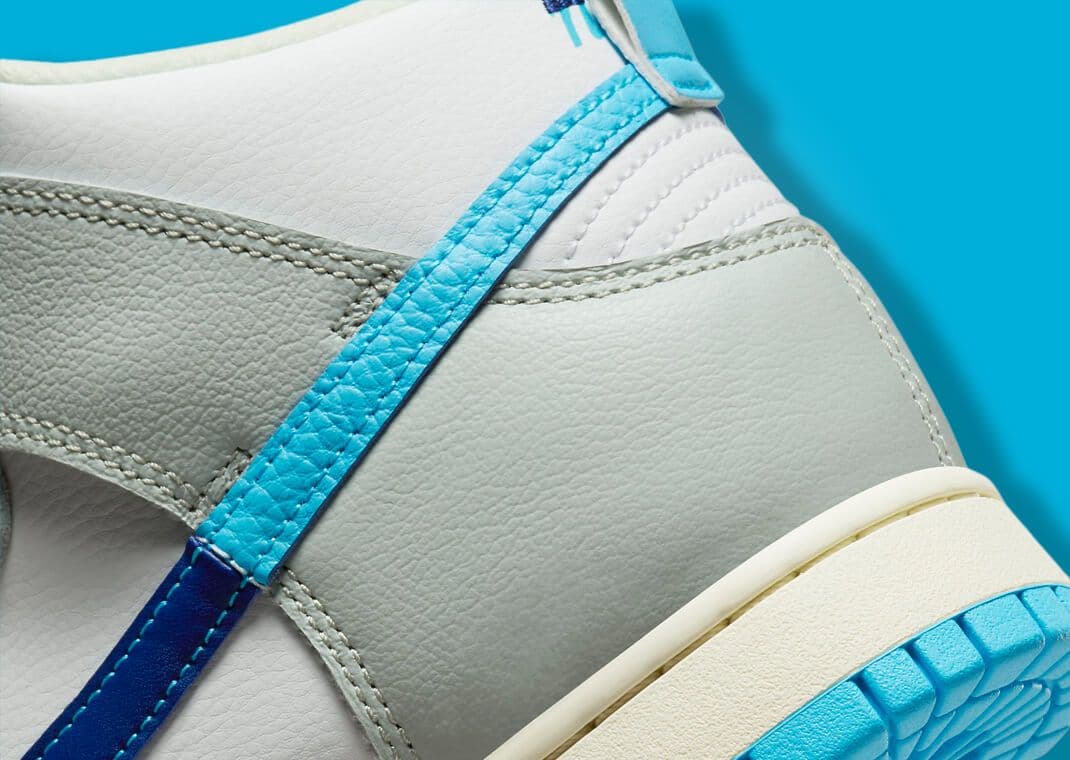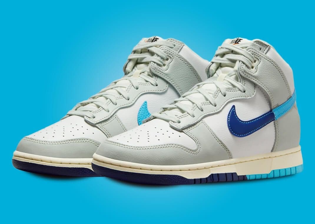 Outfitted in a full leather construction, this Dunk High works on top of a crisp summit white base and is overlaid by light silver paneling throughout. While it bears a striking resemblance to 2021's "Vast Grey" at the moment, that's where all the similarities end. A Swoosh shoots through the lateral and medial sides that's split between Baltic Blue and deep royal blue hues, and this contrasted theme extends towards the rubber outsole underfoot. That's not all though, as the "Nike" logo around the heel and insole also boast a juxtaposed aesthetic, switching between the Beaverton brand's current font and the one that it used back in the '70s, bringing together the classic and the contemporary.