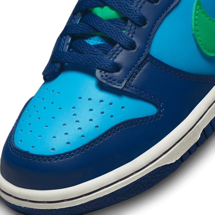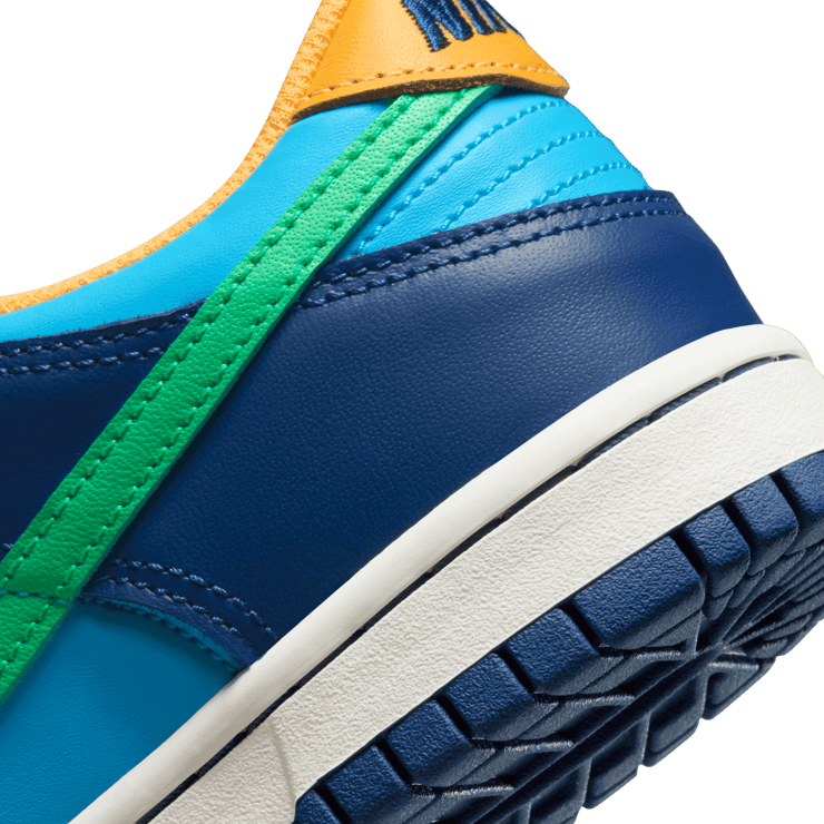 Offered in a full leather outfit that's sleek and smooth to the touch, the inner base is painted in a vibrant blue hue, and this is contrasted by dark navy tones along the lacing system, toe box, and heel. A bold green Swoosh glides across the lateral and medial side panels, while the tongue, heel badge, and sockliner are all drenched in a yellow palette that is sure to turn heads wherever you go. This is all offset by a crisp white midsole underfoot that brings things back to basics.