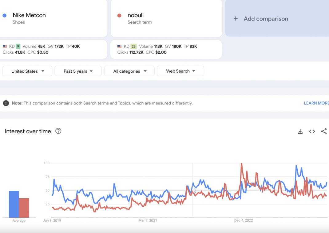 According to Google Trends data, the search term "Nike Metcon" has consistently outperformed both "Reebok shoes" and "NOBULL" over the past few years. The data, visualized in the attached graphs, clearly shows the rise of Nike Metcon in search interest. While Reebok's dominance faded with the end of their CrossFit partnership and NOBULL emerged as the new official sponsor, Nike Metcon has steadily grown in popularity, cementing its position as the top cross-trainer choice for athletes worldwide. Outside of hard data, if you walk into a gym across the globe, you’ll likely see many sporting Nike sneakers, specifically Metcons.