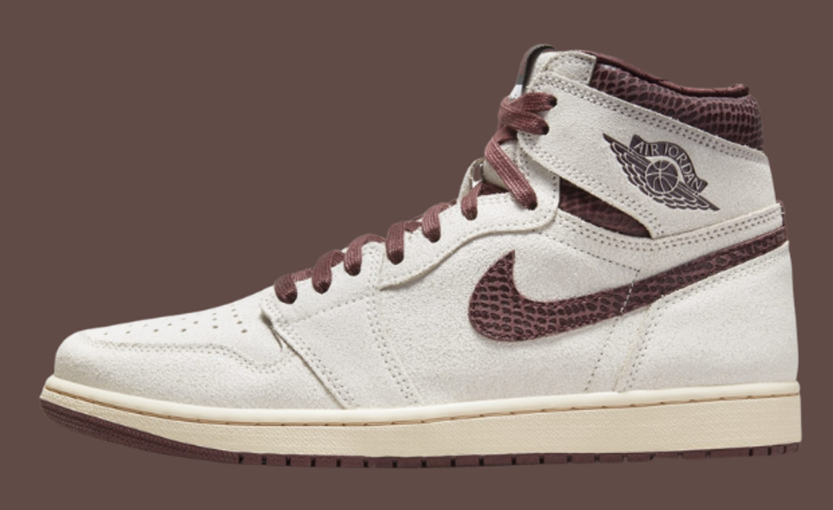 The A Ma Maniere x Air Jordan 1 Retro High OG comes in a clean sail and burgundy crush colorway. Featuring a full-sail based premium suede upper. Burgundy crush accents are found via the snakeskin-like detailing on the “Swoosh” on the sides as well as wrapping around the collar. It also adorns the “Wings” logo on the ankle, quilted liner, laces and outsole. A sail colored midsole provides a vintage vibe while custom branding found on the tongue tag and insoles round things out.