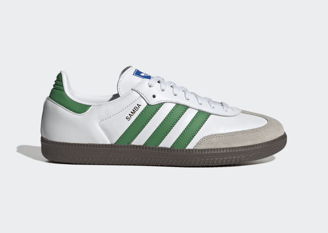 Providing some pop to the Samba, the “White Green” colorway sees the addition of green leather on the Three Stripes and heel tab. Just like other “OG” Sambas, the T-shaped suede overlay is present with this coloway getting a tan finish. Other details include the golden “Samba” text on the midfoot, blue adidas branding atop the tongue, and a gum rubber sole unit.