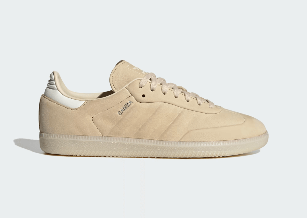 Lux materials take over the adidas Samba “Sand Strata.” The entire upper is enveloped in a butter-smooth leather that comes in an earthy “Sand Strata” shade. Details like the toebox overlay and Three Stripes are incorporated into the leather. However, the iconic “Samba” text remains in a golden hue. Rounding out the design is the off white leather heel tab and light tan rubber sole unit.