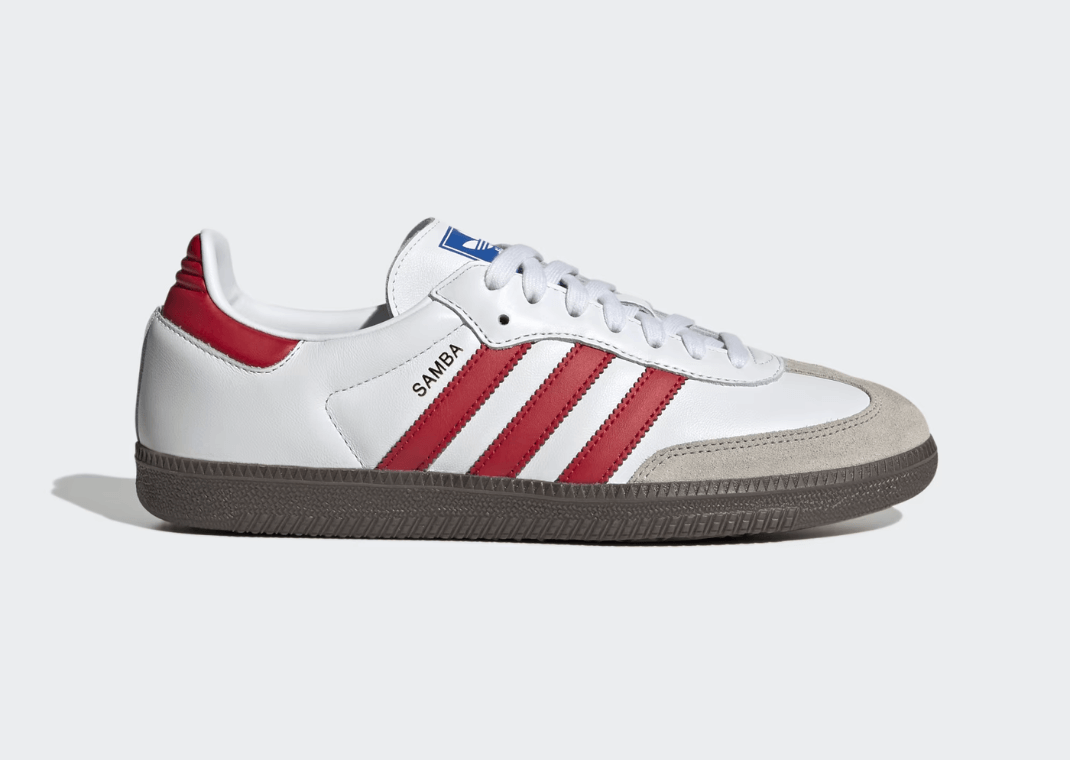 The adidas Samba OG in the “White Red” colorway follows the same pattern as the other “OG” iterations of the Samba with its white leather upper, accenting T-shaped suede panel, and a gum rubber sole. This pair, as the name suggests, features red hits on the leather Three Stripes and heel tab.