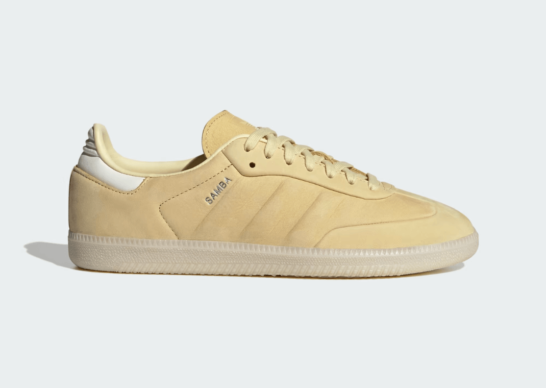 Another premium leather version of the adidas Samba, this “Almost Yellow” iteration covers the buttery leather in a yellow hue. Details like the Three Stripes and T-shaped overlay on the toe come incorporated into the single piece of leather while we see accenting hits on the silver “Samba” text and off white heel tab. Underfoot, a light tan sole unit completes the look.