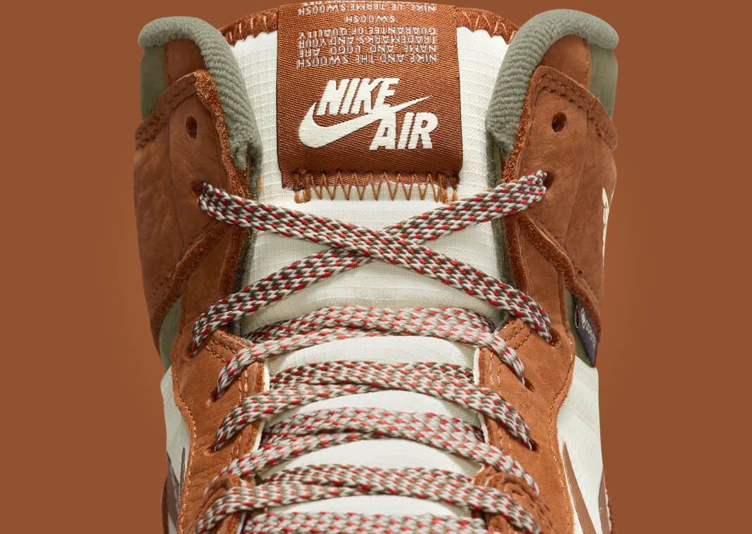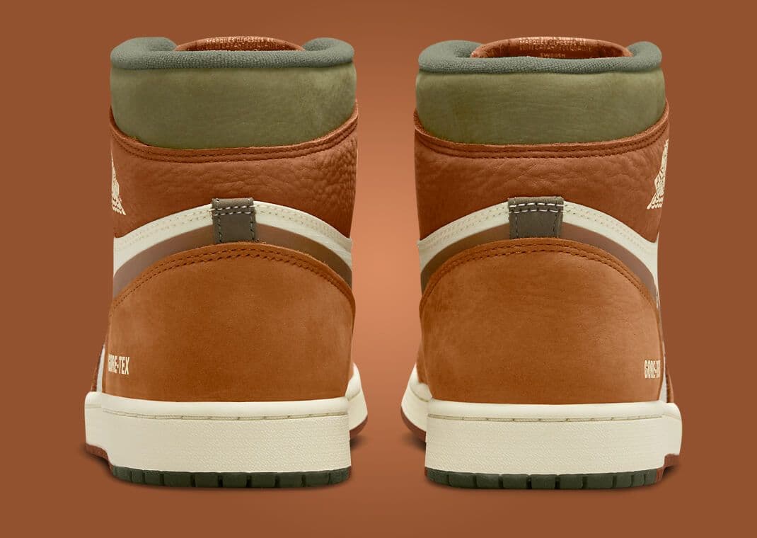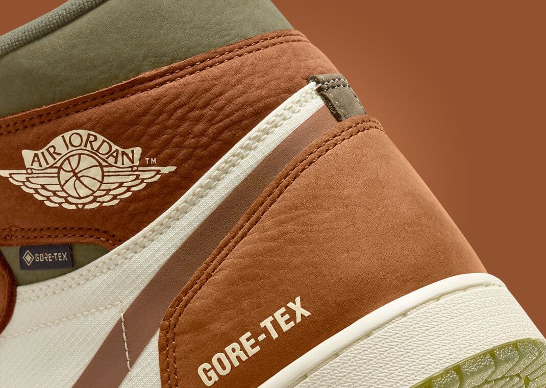 Contrasting this is a rich olive tone that decorates the toe and collar underlay, juxtaposed with neutral sail accents that adorn the tongue and midfoot. The branding is quintessentially Jordan, with the familiar Nike logos accompanied by Gore-Tex insignias placed prominently on the lateral heel, an added tag on the collar, and a standout detail on the right sneaker's insole. The sneaker's base showcases a sail rubber midsole leading into a harmonious brown and olive outsole.