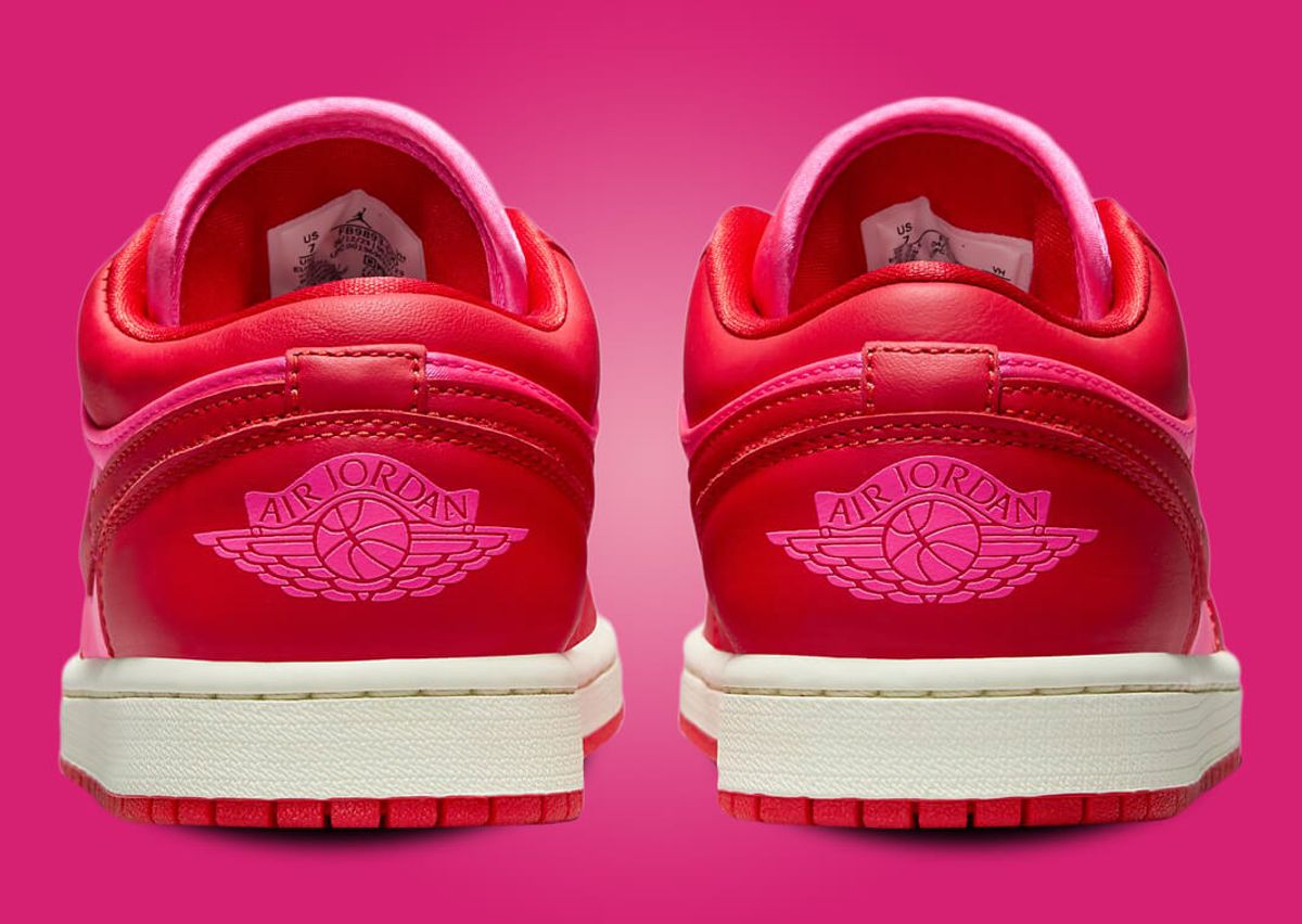 The V-Day Air Jordan 1 Low SE adopts a bold two-tone colorway that perfectly captures the Valentine's Day spirit. The upper features a spicy chile red leather adorning the mudguard, eyestays, collar, heel, and Swoosh. This red contrasts beautifully with the plush pink satin on the toebox, tongue, and quarter panel. Laces echo the same pink hue, tying the design together quite literally. The Jumpman logo on the tongue tab showcases the vibrant chile red, while the Wings logo on the heel borrows the pink shade. Finalizing the look is a sail-colored midsole combined with a chile red outsole.