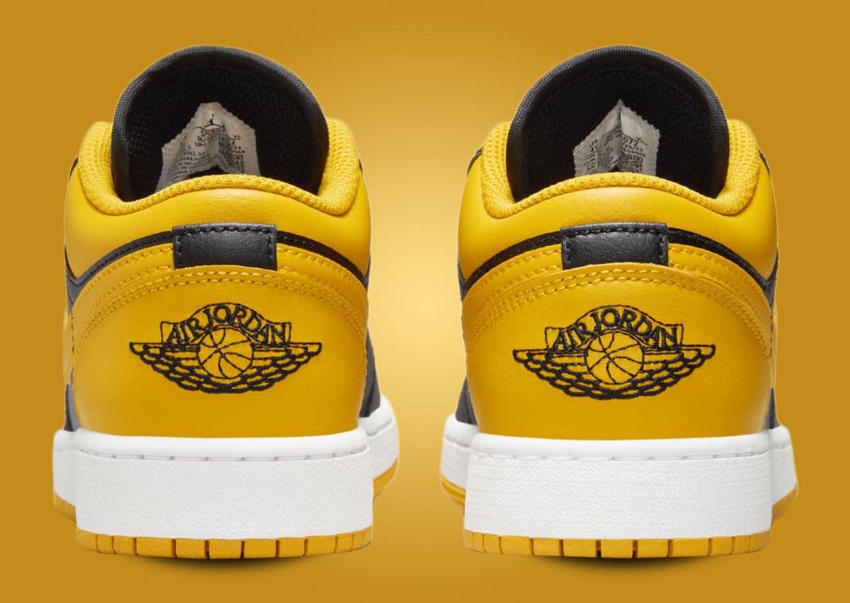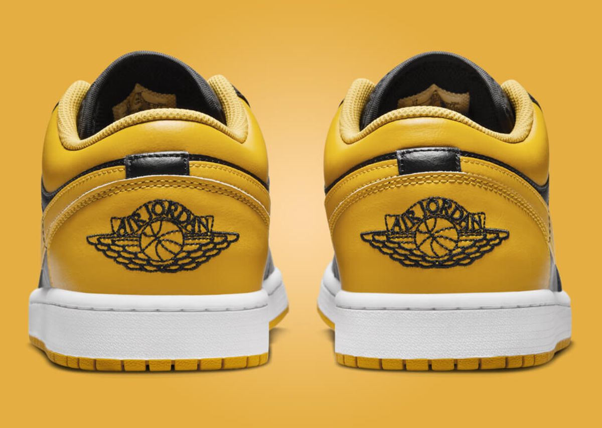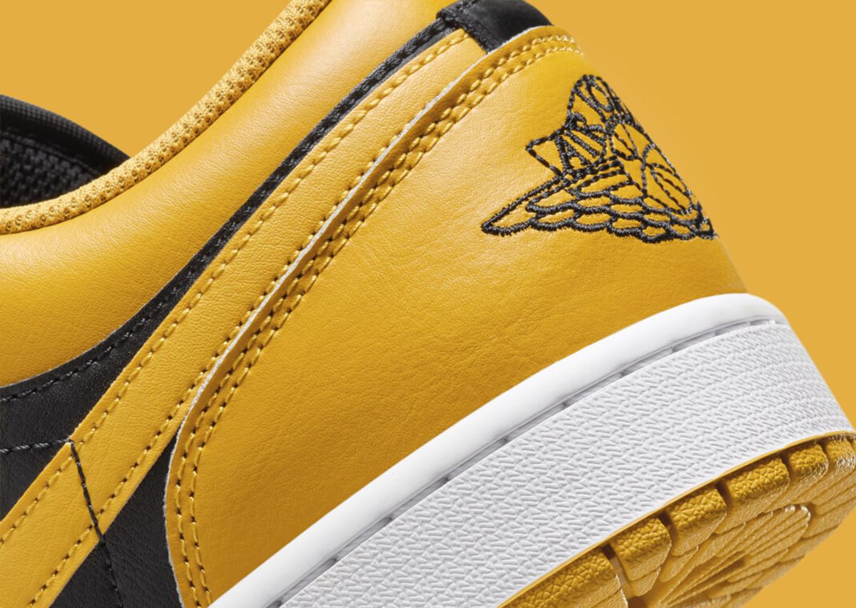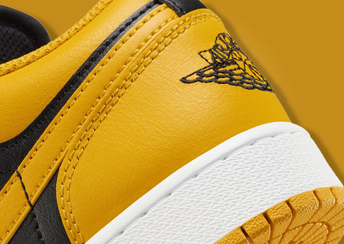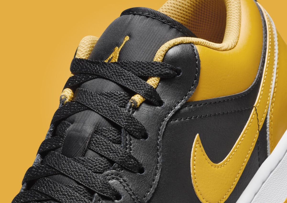 Mimicking the AJ1 High Yellow Ochre, this version of the AJ1 Low features an all-leather construction. Black leather finds its way onto the mudguard, eyestays, and quarter panel. Also appearing in black are the nylon tongue and matching laces. However, it's the yellow ochre that steals the show. This vibrant hue adorns the toebox, collar, heel, and Swoosh, injecting a pop of color into the sneaker. The Jumpman logo on the tongue also adopts this sunny hue, further enhancing the color scheme. A black Jordan Wings logo stands out on the yellow ochre heel, while a clean white midsole and a yellow ochre outsole complete the design.