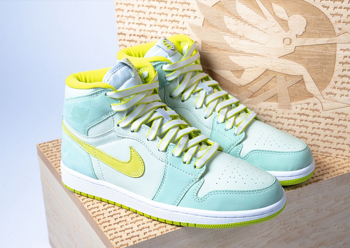 Combining past, present, and the future of women’s athletics with an Oregon flair, the sneaker comes dressed in shades reminiscent of the school's colors. Around the mudguard, eyestays, and heel overlays, a light aqua green suede rests near the white toebox, midfoot panel, and collar. Two-tone yellow and white laces work up to the tongue tag that receives a redesign courtesy of Hatfield, a Title IX logo featuring Oregon Ducks branding within, though a second set of laces in a tonal green shade are included as well. More yellow hits appear on the Nike Swoosh and collar, matching the rubber outsole underneath. Finishing off the sneaker is a white AJ 1 midsole.