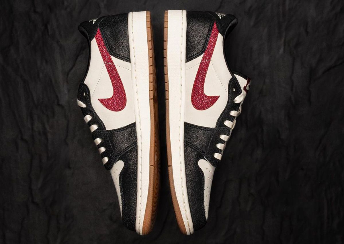 Following suit with other collegiate PEs on the AJ 1 Low OG, the leather overlays receive a cracked finish, while the base layer below gets a smooth finish. These cracked overlays come in a deep black finish, while sail hues contrast this on the toebox, quarter panel, and tongue. Tonal laces match these underlays while added details, like the pebbled leather Swoosh, take on a red makeover. Continuing this red hue, we see the mini Swoosh on the mudguard, Nike Air text atop the tongue, and the “OU” branded insole covered in the shade. Rounding out the look is the sail AJ 1 midsole paired with a gum rubber outsole.