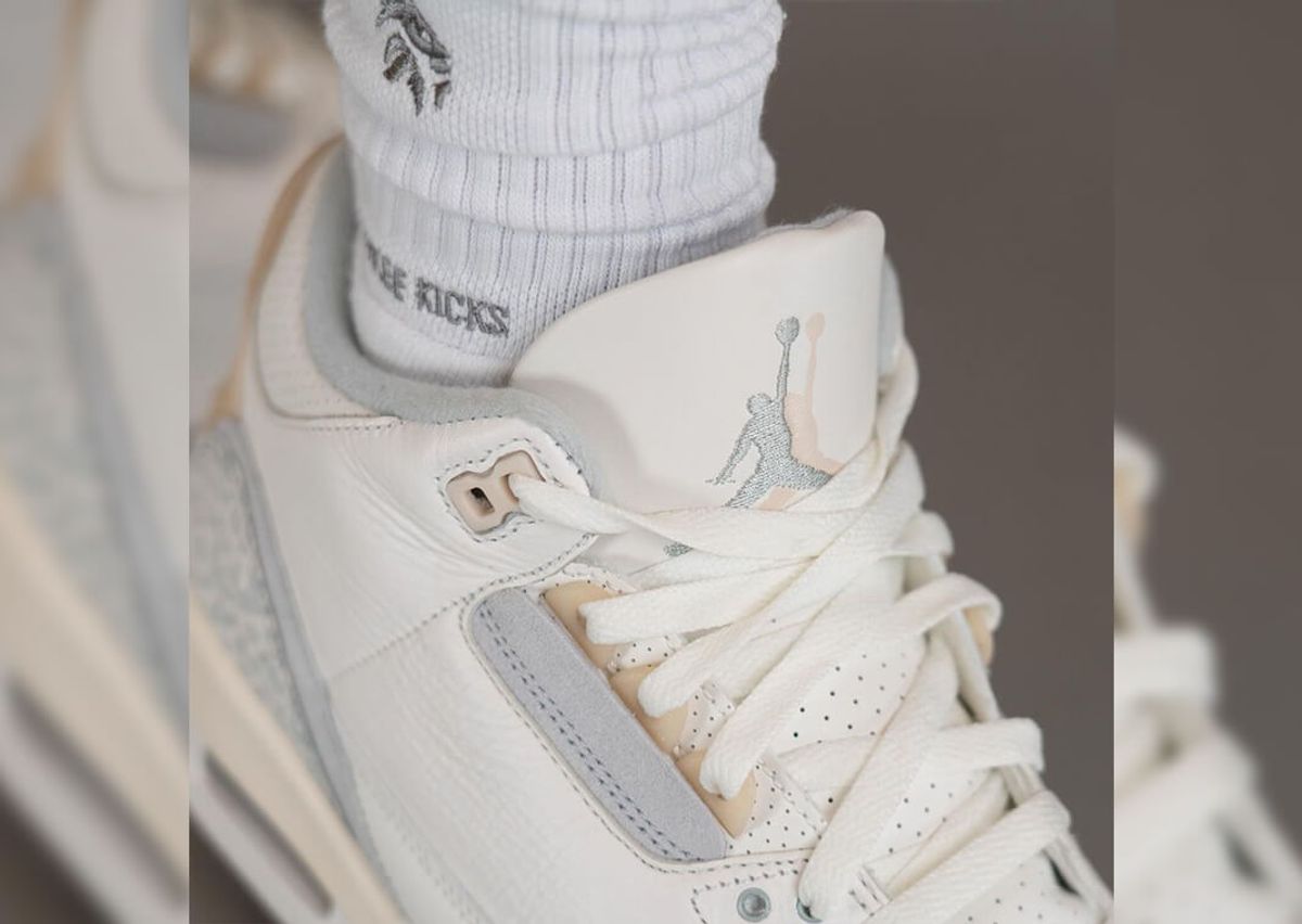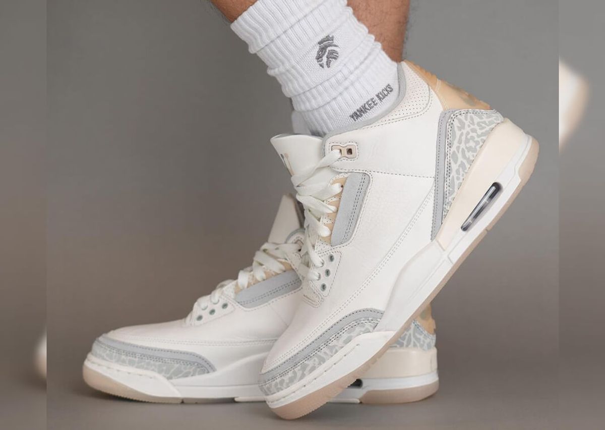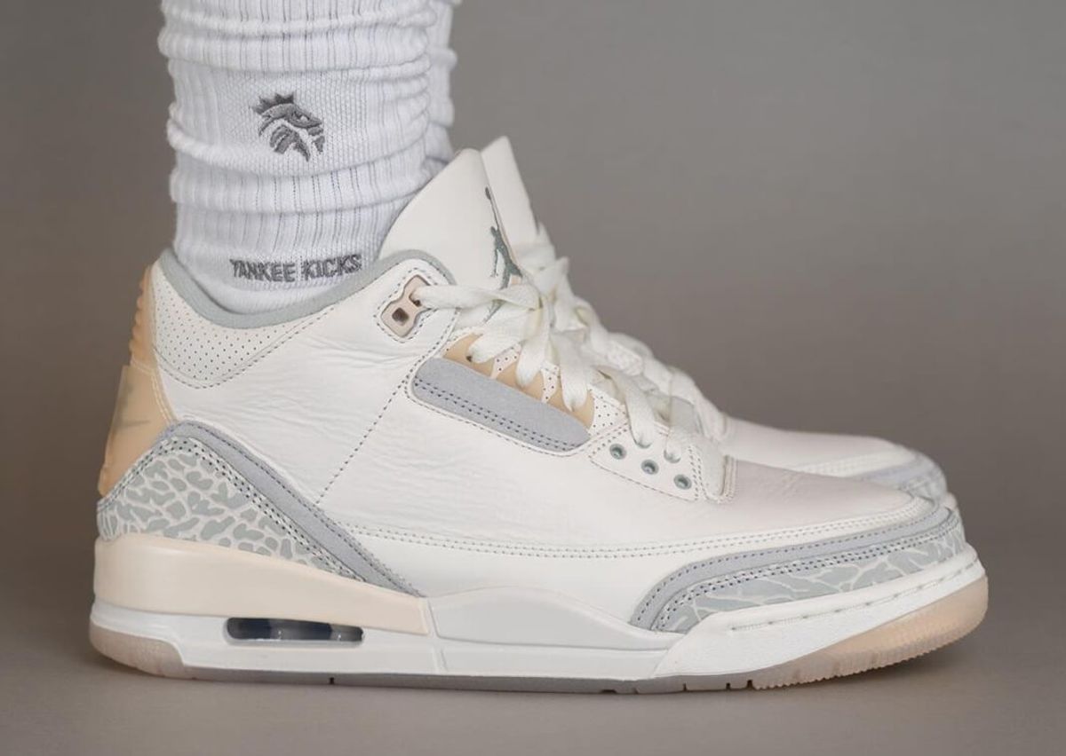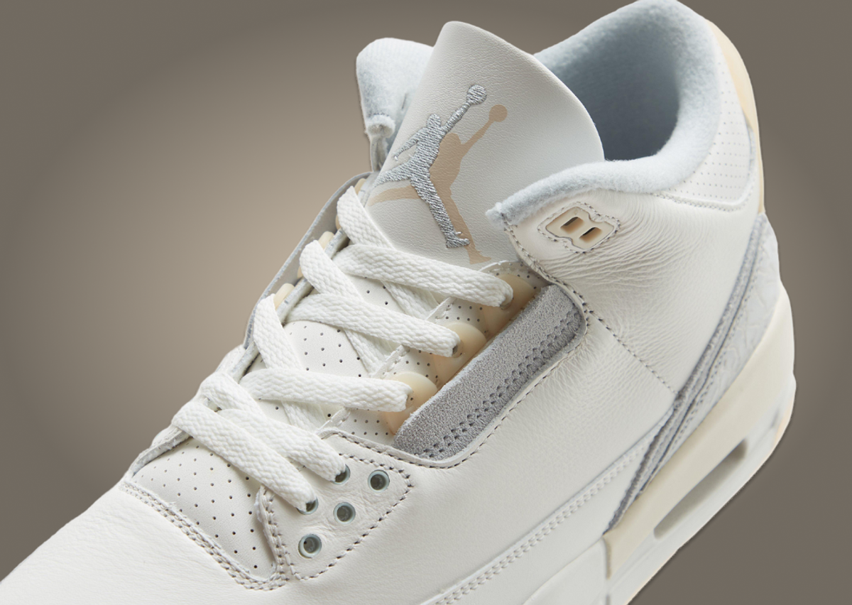 Set in ivory, grey mist, and cream, the Air Jordan 3 Craft features the usual tumbled leather upper with grey suede details hitting the mudguard and heel. Each panel has a muted elephant print design, while a secondary panel is stacked below in a solid grey hue. More of this suede marks the eyestays below the aged semi-translucent eyelets. The iconic heel tab comes with a semi-translucent aged finish similar to the eyelets, featuring both Jumpman and Nike Air branding. Atop the tongue, we see a double Jumpman logo, one embroidered in grey mist and the other stamped onto the leather in cream. Underfoot sits the usual AJ 3 midsole in a creamy hue paired with a semi-translucent clear rubber outsole.