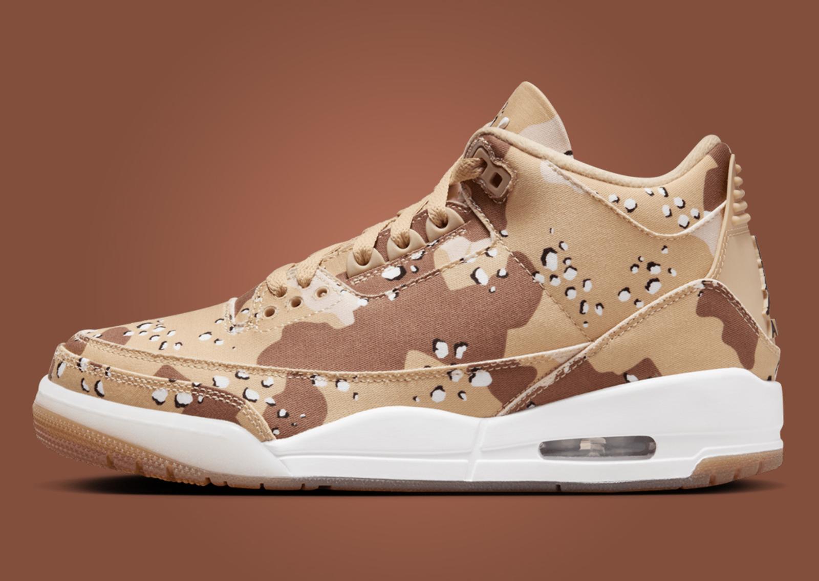 This new Air Jordan 3 features a canvas upper adorned with a camo pattern, reminiscent of the women's Nike Dunk High Camo from 2022. The camo design incorporates various tan and brown shades, creating a visually striking yet versatile look. Atop the tongue sits a 3D sail Jumpman logo, adding a touch of classic Jordan branding. The heel showcases a black Jumpman logo on a tan heel tab, maintaining the sneaker's cohesive aesthetic. Inside, the WNBA's logo in orange pops against the white insole, further emphasizing the collaboration. The design is rounded out with a sail rubber midsole and a semi-translucent gum rubber outsole, featuring sail and orange accents for added flair and functionality.