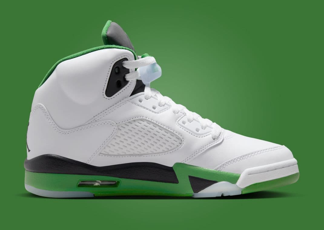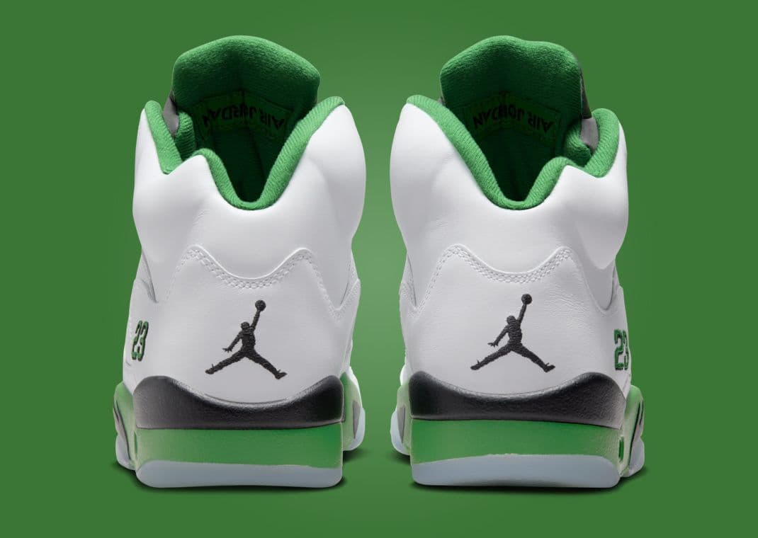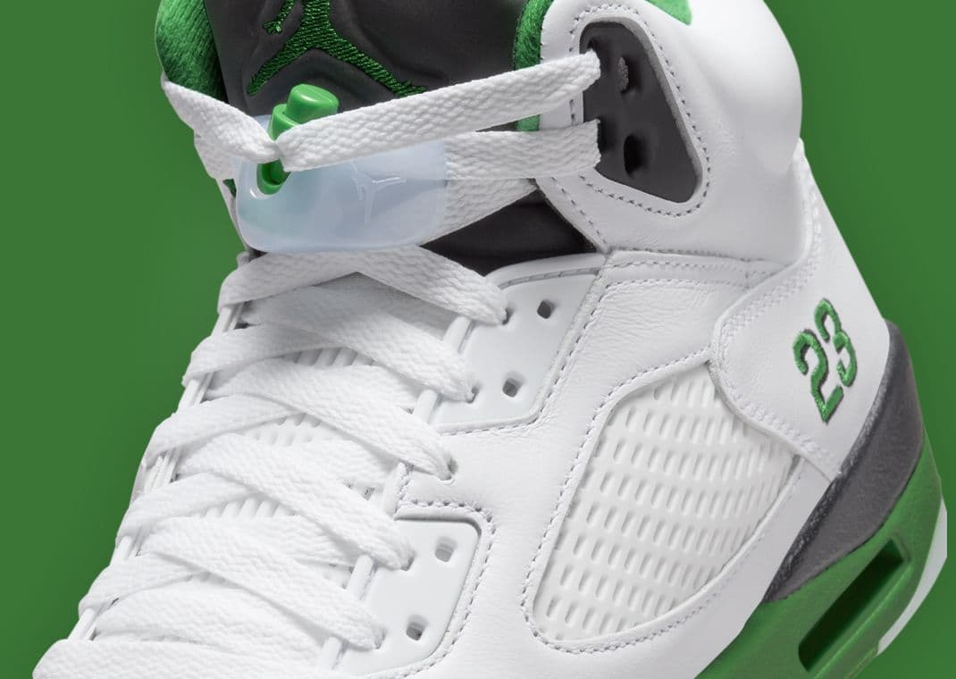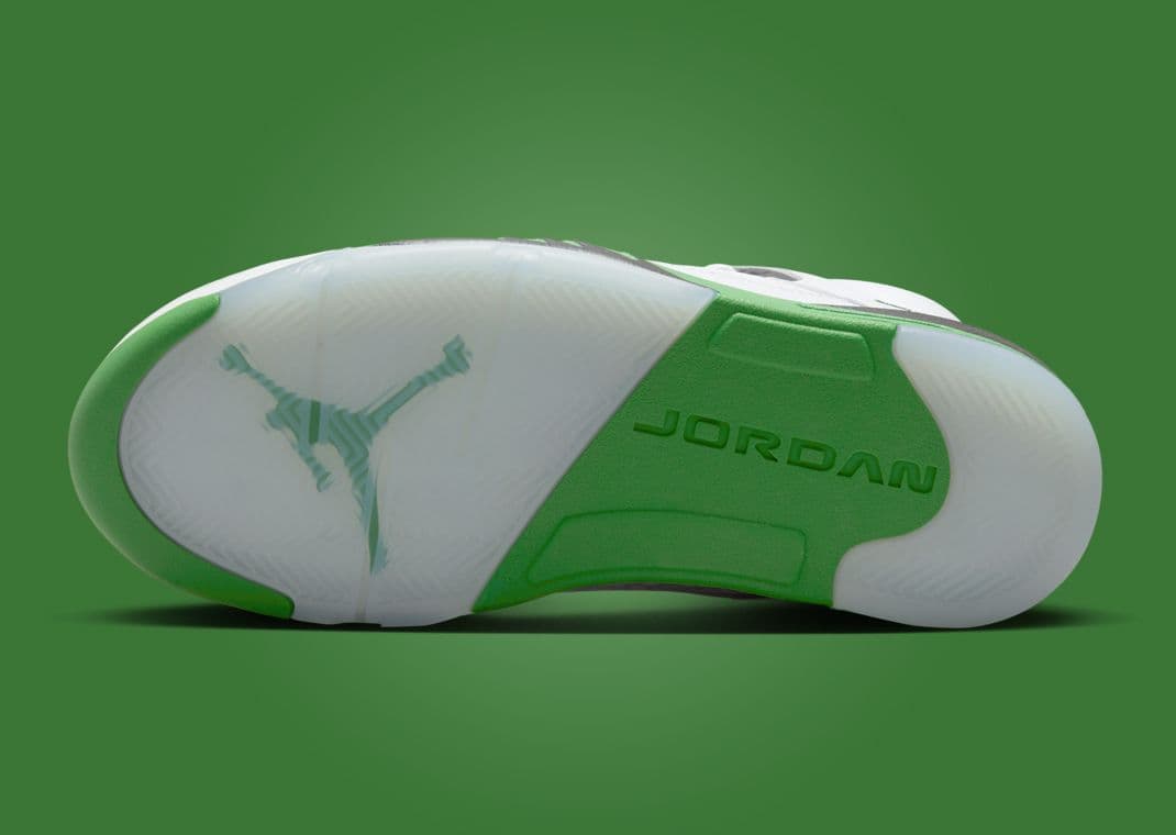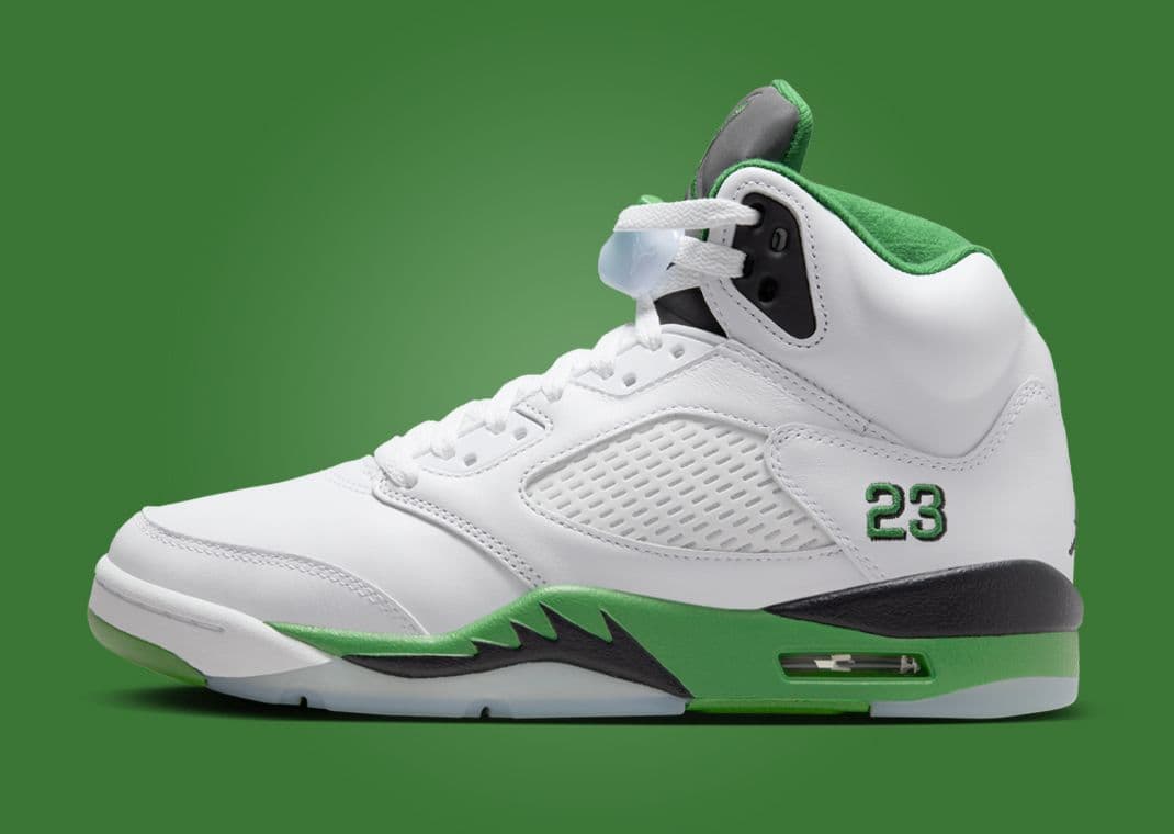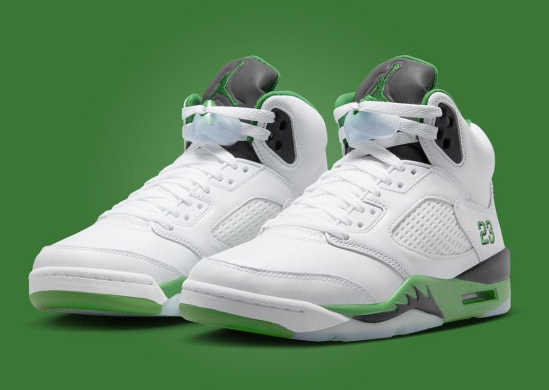 Drawing inspiration from the women's exclusive Air Jordan 1 Retro High OG Lucky Green, this Air Jordan 5 Retro follows in the footsteps of the AJ 3 Lucky Green. The significant difference between this upcoming AJ 5 and other Lucky Green-themed pairs is that they will not feature red accents. Instead, this pair features a white-based leather upper with green and black accents, finished off by icy blue translucent hits on the outsole. This Jordan 5 dons a lucky green midsole paired with the AJ 5 signature shark tooth in black. Michael Jordan's iconic "23" adorns the sneakers heel. A black tongue and lucky green Jumpman on the tongue round out this Jordan 5.