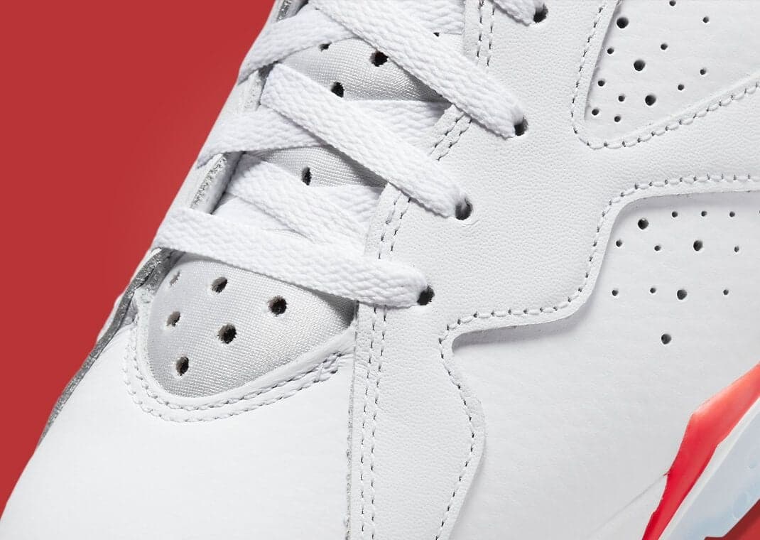 Fresh for Summer 2023 is the Air Jordan 7 Retro "White Infrared." Taking direct design cues from the OG AJ 6 in the same color scheme, this pair sports a white-based all-leather upper. Infrared hits, dubbed "Crimson" on this specific pair, can be seen via the midsole, with black acting as the main accent, seen via the embroidered Jumpman on the collar, back heel pull tab, and parts of the neoprene tongue. A solid white midsole/outsole combo and complemented by hits of translucent icy blue, found underneath the hits of infrared.