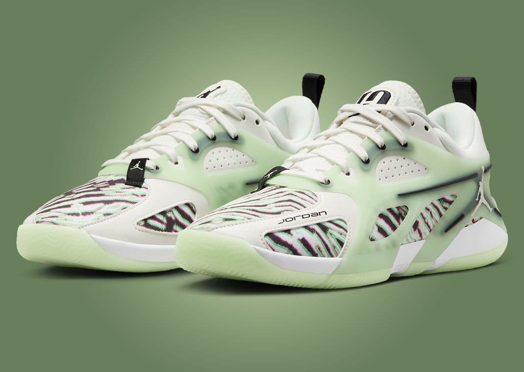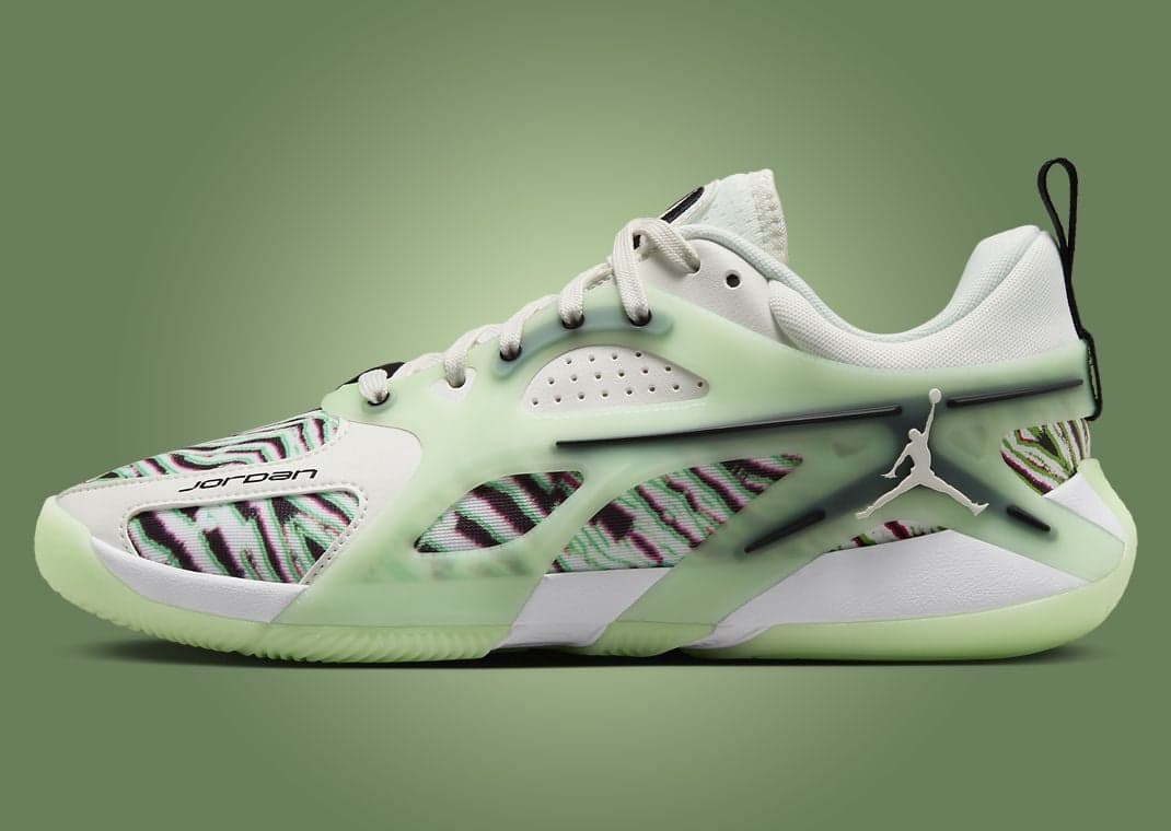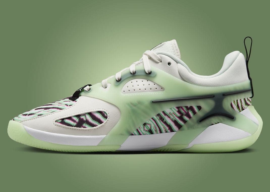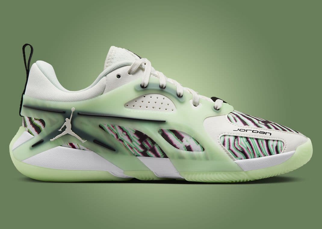 The Jordan Heir showcases a striking combination of materials and colors designed to stand out on and off the court. The sneaker features a mesh base with leather overlays around the toe, eyestays, and midfoot for enhanced durability and support. A large TPU panel covers the midfoot and heel, providing stability and a modern aesthetic. This Sail Vapor Green colorway is eye-catching, with vapor green hues dominating the TPU overlays. The base mesh presents a zebra pattern incorporating black, pink, white, and green, adding a vibrant and dynamic look.