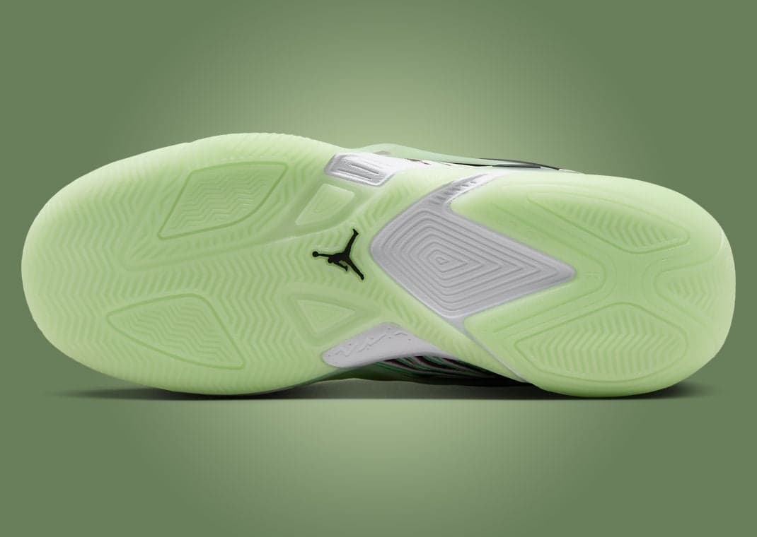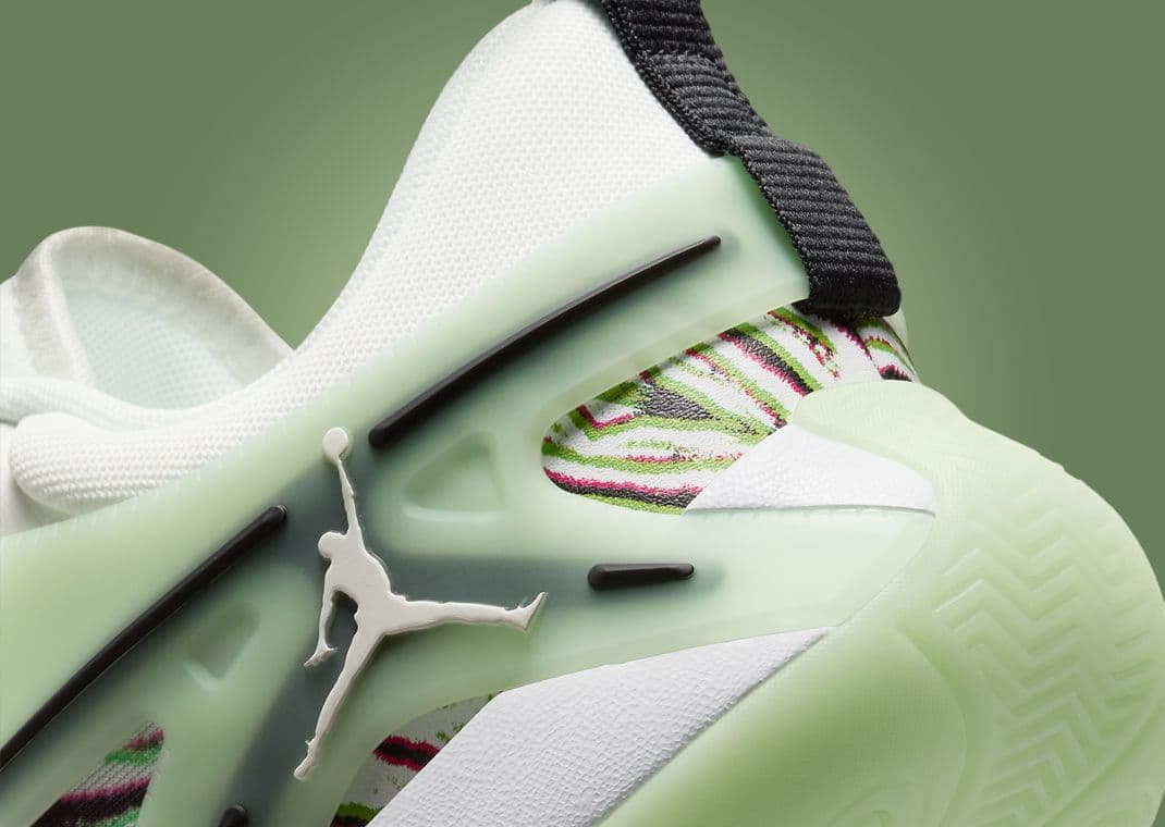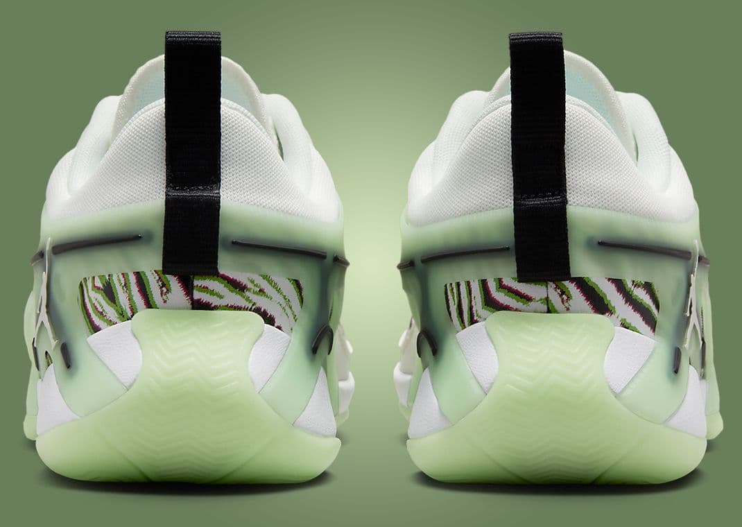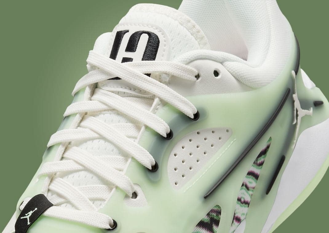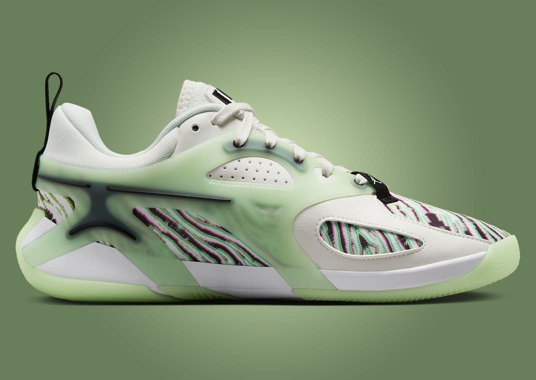 The Jordan Heir showcases a striking combination of materials and colors designed to stand out on and off the court. The sneaker features a mesh base with leather overlays around the toe, eyestays, and midfoot for enhanced durability and support. A large TPU panel covers the midfoot and heel, providing stability and a modern aesthetic. This Sail Vapor Green colorway is eye-catching, with vapor green hues dominating the TPU overlays. The base mesh presents a zebra pattern incorporating black, pink, white, and green, adding a vibrant and dynamic look.