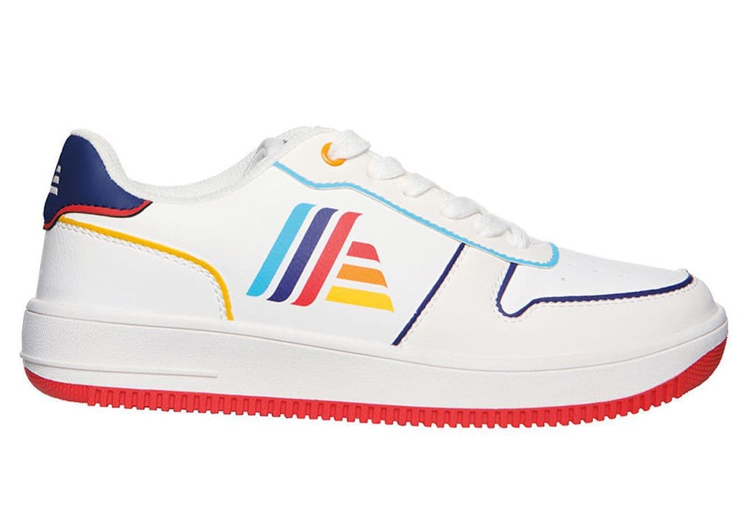 Key highlights include the ALDI logo prominently displayed on the tongue tag and heel, adding a signature touch to the design. The women's pair takes it further with a multi-colored ALDI logo adorning the midfoot and multi-colored piping that outlines the panels, injecting a playful element into the classic silhouette—a sturdy rubber midsole and outsole round off the design, providing reliable traction and support.