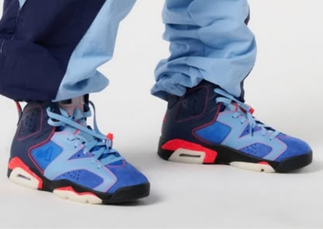 Rumors of the Awake NY x Air Jordan 6 pack sprung up last year, but the Brooklyn-based streetwear label finally confirmed at least one of the two pairs via a model in the brand’s Spring/Summer 2026 lookbook. The first photo shows us the Midnight Navy colorway, which looks like a collage of color schemes placed across the AJ 6’s panels. Game Royal shades appear on the suede underlays, with light blue (almost like UNC’s famous shade) appearing on the midfoot overlay, laces, and lace shroud. Midnight Navy takes over the heel and collar, while the entire upper is stitched with infrared 23 for a bright contrasting pop. Final details visible include Awake’s baroque “A” logo, a black and infrared 23 midsole, and a clear rubber outsole.
