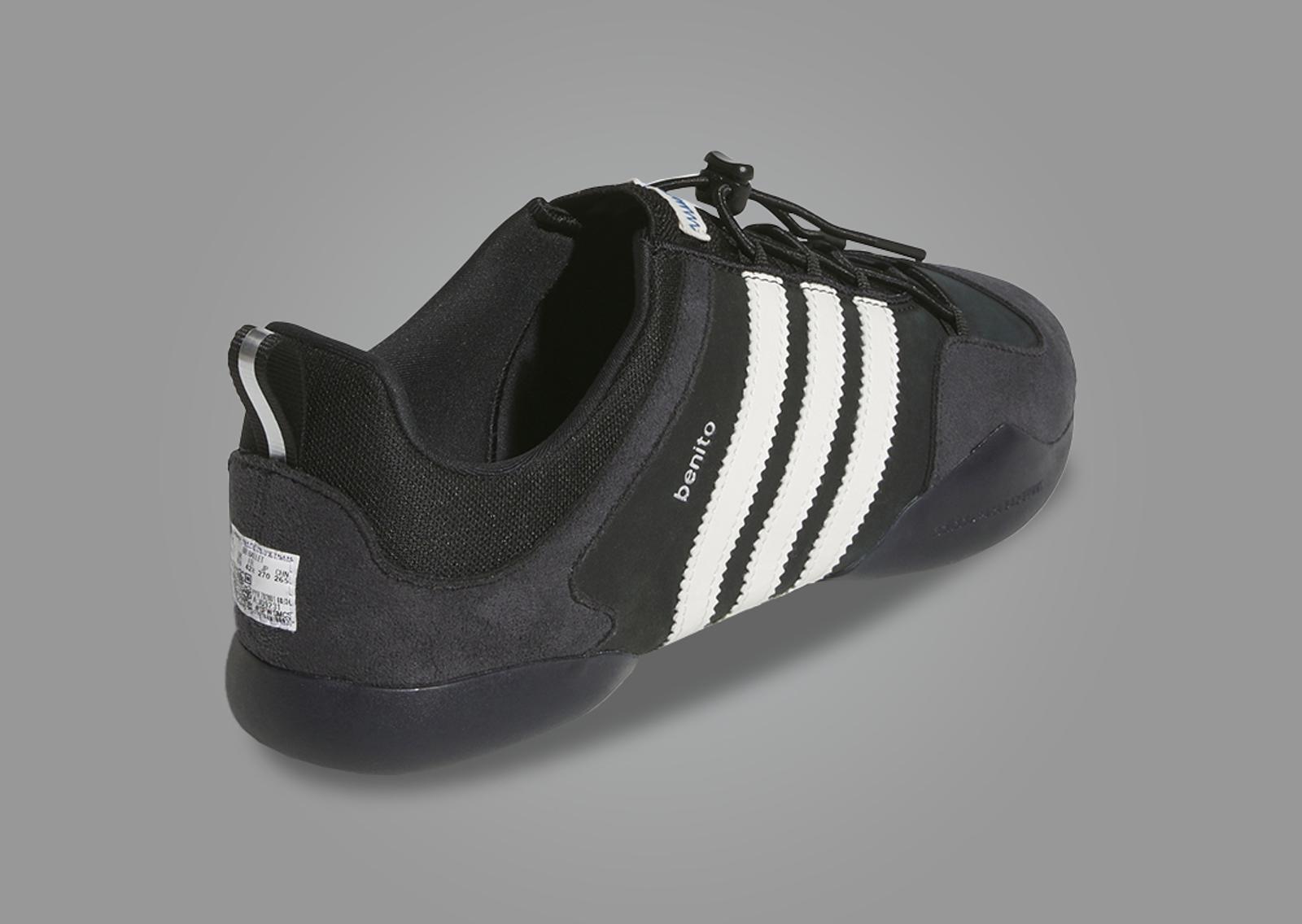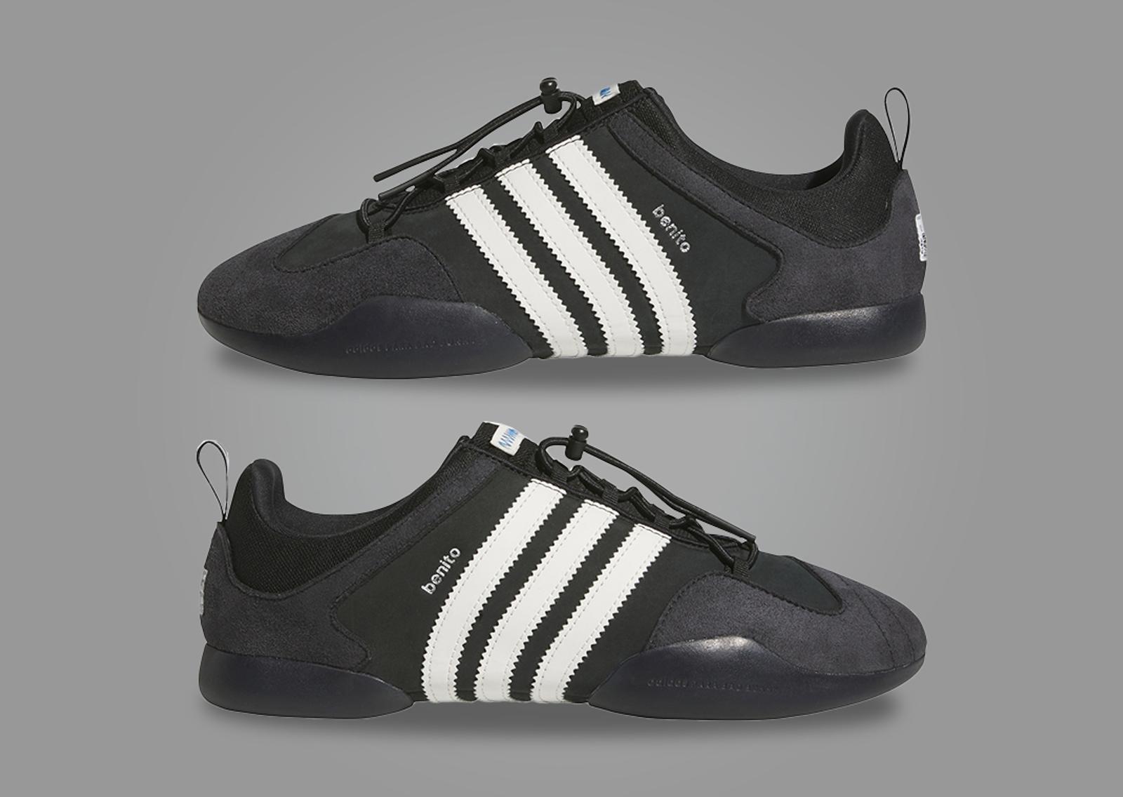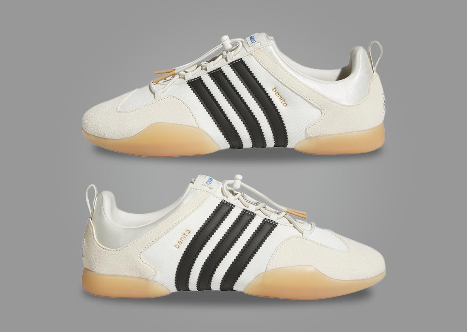 Seen in three color palettes, one in Off White, the other in Core Black, and a third in Bold Gold, the pair resembles the aforementioned adidas Taekwondo from 2019, a lace-less slip-on low-top silhouette. However, Benito adds ballerina-inspired design details, like the satin paneling on the base layer, to help create an all-new sneaker. Suede panels add textural contrast to the upper and come located on the toe and heel.