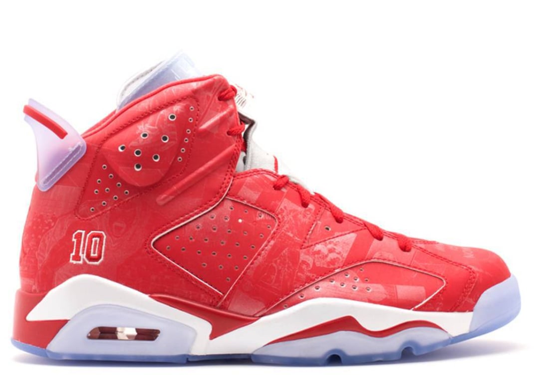 A limited-edition pair made in collaboration with the Japanese manga and anime series “Slam Dunk,” this Air Jordan 6 contains the jersey number of the series' lead character, Hanamichi Sakuragi, and hosted anime graphics on its all-red upper. The Air Jordan 6 Retro Slam Dunk stands out for its pop-culture crossover appeal and vibrant design.