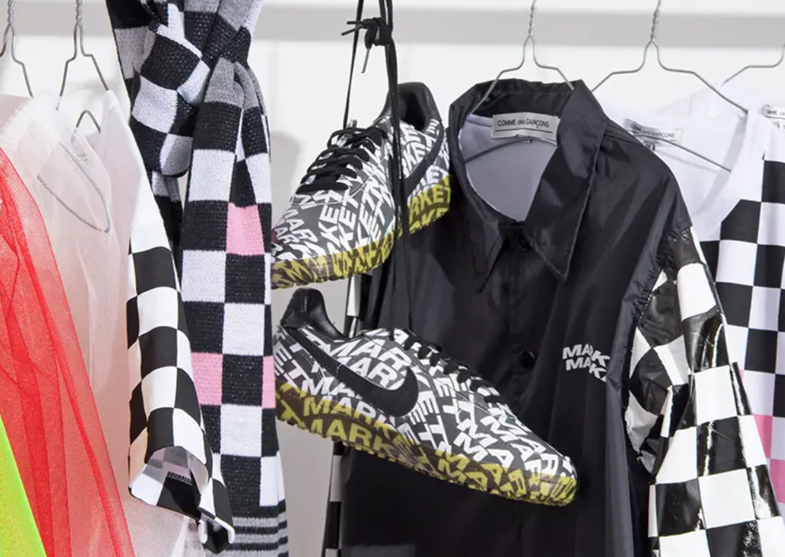 Coming as part of CDG’s upcoming Black and Pink MARKET MARKET pop-up shop at the Harajuku Hakkakukan building in Shibuya, Tokyo, the sneaker takes on a black base layer with MARKET MARKET branding plastered in a warped pattern across the entire upper in white. More solid black hits are found on the lace set, sockliner, heel tab, and Swoosh, with the tongue dipped in the MARKET MARKET graphic print. Not visible in these photos are the heel tab and insole, which possibly come with BLACK CDG branding details. Underfoot, the midsole takes on a translucent gum finish to reveal the MARKET MARKET print that extends down the sidewall onto the rubber outsole.