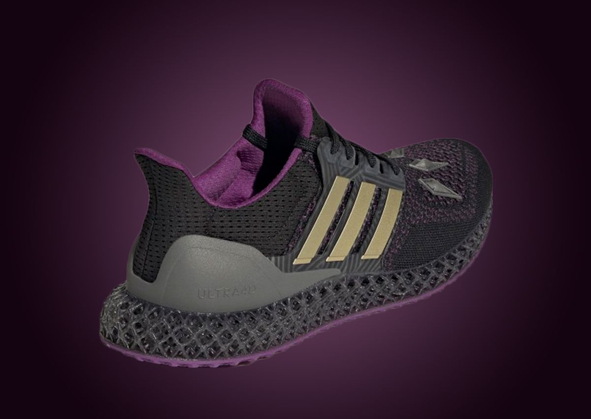 Coming in the same color palette as the Black Panther x Mahomes 1 Impact FLX, this Ultra 4D utilizes the typical Primeknit upper with added details nodding to Black Panthers suit found throughout. Placed on the purple and black toebox are a set of diamond-shaped overlays that mimic those found on the suit of Chadwick Boseman’s character while the golden Three Stripes-branded cage gets a linear pattern following this same theme. More branding details found on the top of the tongue and on the co-branded Black Panther and adidas insole continue to come in gold while the grey plastic heel counter keeps things monochromatic with its “Ultra4D” text. Underfoot, a black 4D midsole gets paired with a purple Continental rubber outsole. Rounding out the entire collaboration is special co-branded packaging that follows in line with the regal color scheme of purple and gold.