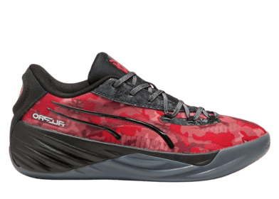 Shades representing the Trailblazers cover the sneaker’s mesh upper, with this portion containing a camo graphic throughout. Deandre Ayton’s custom logo is integrated into this camo pattern, and you’ll also find it placed in red on the tongue of the left sneaker. Grounding the color palette are black accents along the TPU formstrip on the lateral side, black mesh on the medial side of the upper, textured leather along the eyelets, and on the sockliner and tongue. Inside, the red insole contains a co-branded logo for Ayton and Puma. Underfoot sits a black Nitro Foam-cushioned midsole with grey rubber wrapping up from the rubber outsole.