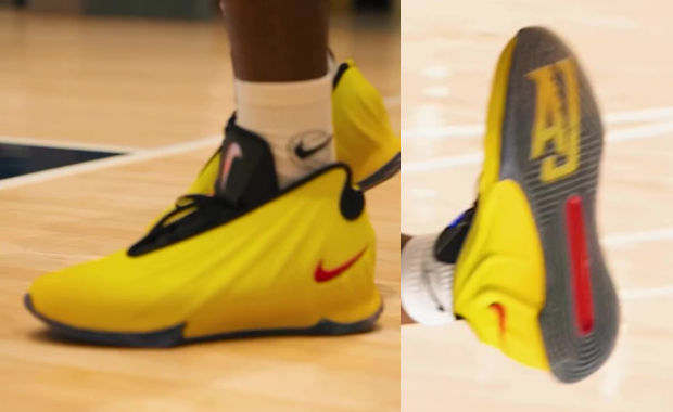 After a string of colorways spotted on Wale, the on-court face of the GT Future, AJ Dybantsa, posted a video wearing his PE colorway of the sneaker. The upper comes covered in yellow hues with red accents on the Swoosh logo on the profile and the left shoe's tongue tag. The right pair features a blue LED Swoosh. Cementing the connection to AJ is his number 3 on the outsole of the left pair and his name on the outsole of the right.