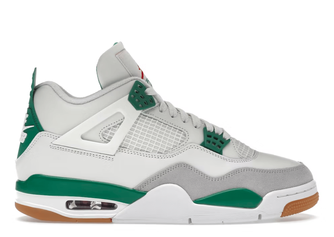 The latest entry in the Nike SB x Jordan Brand catalog is the upcoming Air Jordan 4 "Sail Pine Green. Teased back in 2022, the pair features a super supple leather upper with typical Jordan 4 details. Rubber portions, seen on the wings and heel tab, get a soft finish to allow for more durability against decktape, and tooling is reworked to give a better board feel. Arguably 2023’s most hyped sneaker release, the pair is set to release on March 17th at skate shops and on Nike SNKRS on March 21st.
