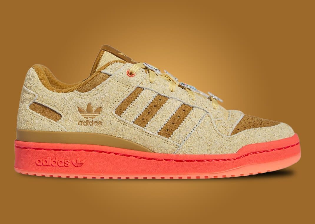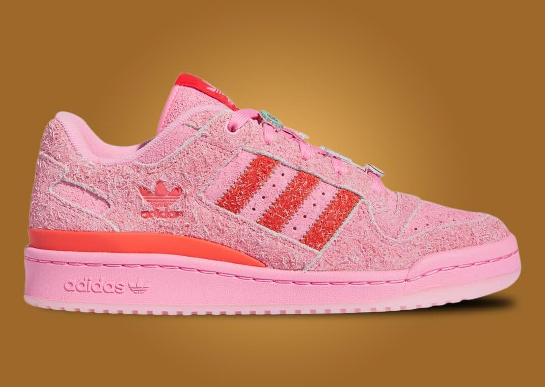 This year's Forum Low collection starts with a stunning women's exclusive in Bliss Pink, paying homage to Cindy Lou. This rendition carries over the same design cues from its 2022 predecessor, with unmistakable Grinch-themed charms dangling from its laces. Joining the roster is another colorway in Oat shades, sporting the same detailed construction and familiar Grinch charms. This pair is a representation of The Grinch's dog Max.