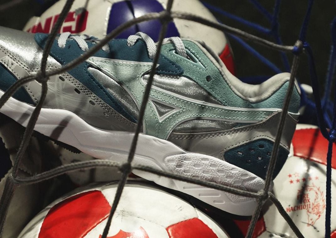 Taking on a mixture of satin, leather, and suede across the upper, the teaser photo showcases a silver, navy blue, aqua, and white-covered silhouette. Silver details take over the satin toebox and quarter panel as well as the leather overlay wrapping from the toe back to the heel. Suede details along the mudguard, eyestays, and perforated heel come in navy blue, accented by aqua-green shades on the Mizuno logo around the midfoot and on the collar. With the post featuring the sneaker inside a soccer net surrounded by soccer balls, it's safe to assume the sneaker’s design is somehow connected to the sport. Branding details for Hanon aren’t visible in this early picture, though expect co-branded details to land somewhere on the model. Rounding out the design is the white EVA-cushioned midsole that features Mizuno’s Transpower cushioning in the heel and a black rubber outsole.
