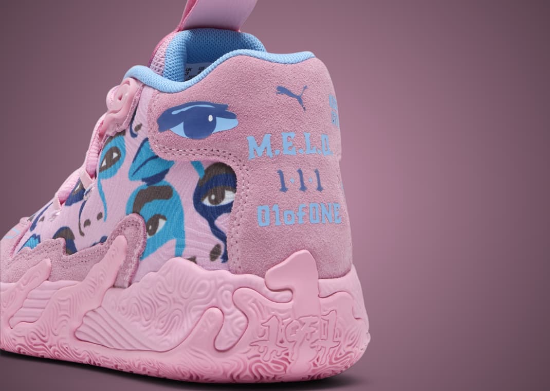 The KidSuper Studios x Puma MB.03 distinguishes itself with a vibrant design that reflects the creative ethos of KidSuper Studios. The sneaker boasts a premium pink leather base adorned with distinctive blue face designs unmistakably KidSuper. Complementing this, pink suede overlays on the mudguard, vamp, and eyestays add texture and depth, while blue accents on the branding elements, including LaMelo's personal and Puma logos, add contrast and highlight the collaborative effort. These logos — RARE, 1 OF 1, and Phoenix — are strategically placed on the tongue and heel. Functionality is not sacrificed for style, as the MB.03 is equipped with a pink foam midsole engineered for on-court performance with Nitro Foam cushioning. The innovative design extends to the outsole, where tonal rubber segments extend up the upper sides, offering enhanced grip and durability.
