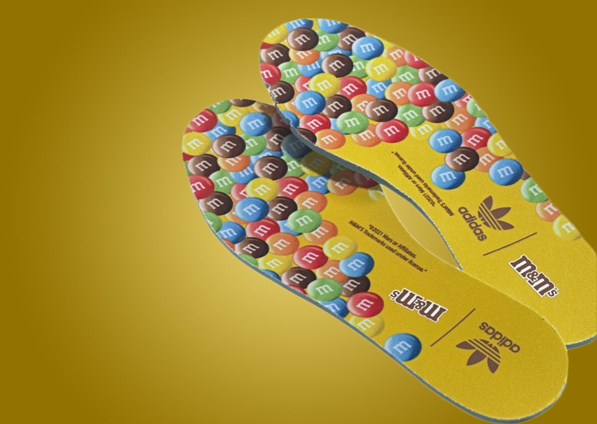 For those looking for customizable options, you’re in luck because included in the packaging is twenty lace jewels, six extra laces, and two straps, all of which feature various M&M’s colors and phrases. Speaking of the straps, the one that comes on the silhouette originally borrows from the yellow upper and features a multi-color combo of M&M’s on the branding window. Chocolate brown appears on the midfoot Three Stripes, sockliner, and rubber outsole while the EVA cushioned midsole with exposed Dellinger webbing in white finishes the candy-coated look.