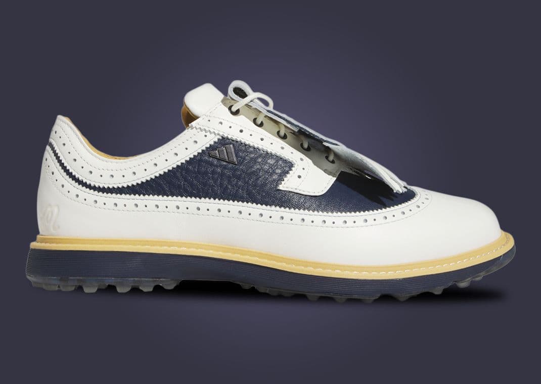 In the footwear segment of the Malbon x adidas Golf Collection, two iconic adidas models, the MC87 and Stan Smith Spikeless Golf, are reimagined with a touch of Malbon's distinctive aesthetic. The adidas MC87 is crafted from premium leather and exhibits a minimalist yet elegant design. The shoe features a predominantly white color scheme, with navy leather accents adding a subtle contrast. The kiltie on the tongue and the combination of Malbon's "M" logo and adidas' mountain logo provide unique branding elements. A blue midsole and a functional spiked rubber outsole complete the design, ensuring both style and performance on the golf course.