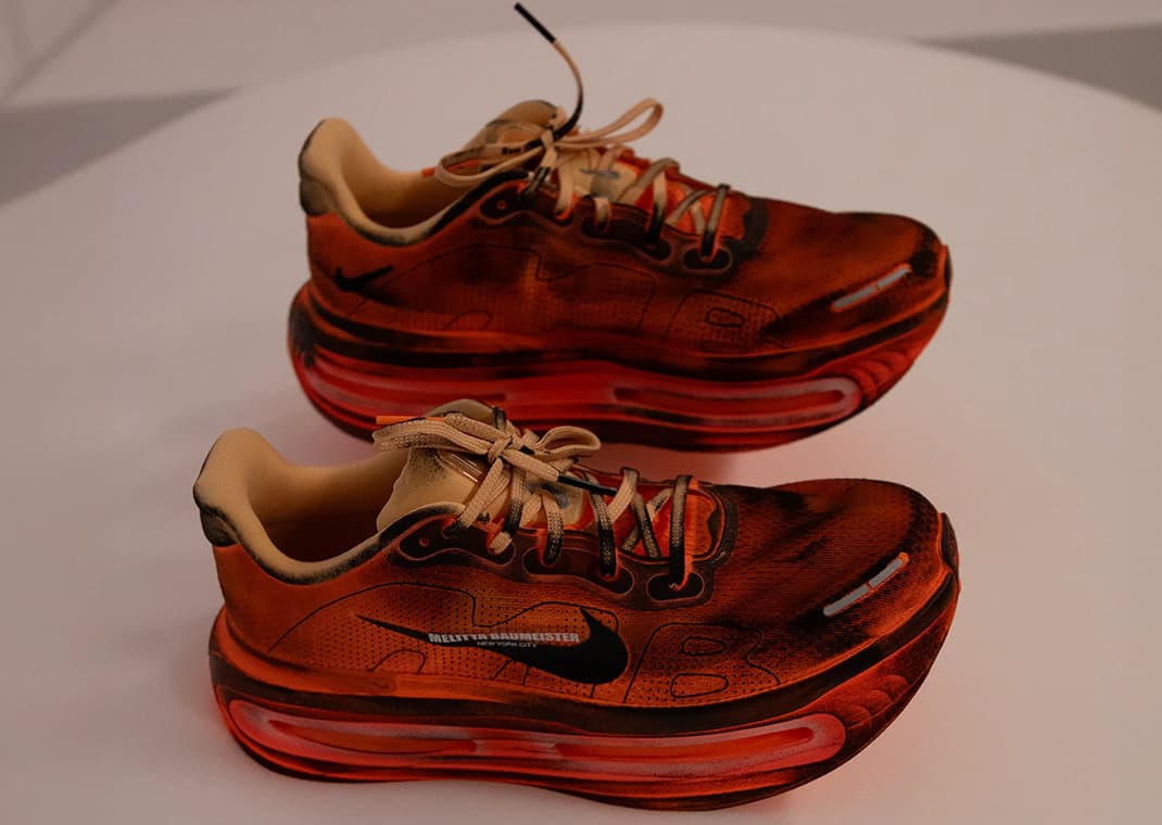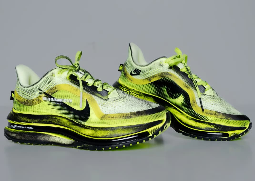 - The Melitta Baumeister x Nike Running Collection features two pairs of black ash-splotched running shoes with bright citrus bases, a Vomero Premium in orange and a Pegasus Premium in yellow