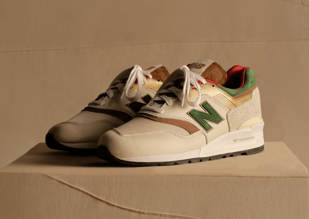 The New Balance 997 Made in USA Paris showcases a premium construction with nubuck, leather, suede, and velvet materials adorning the upper. The color palette draws direct inspiration from the New Balance Le Marais store in Paris. The sneaker features tan hues on the mudguard and midfoot, complemented by green suede on the N logo and velvet collar. The midfoot is accented with metallic gold tumbled leather, contrasting with the brown hairy suede tongue. Additional details include red on the sockliner and tan nubuck near the vamp. A cream 997 midsole and a black outsole ensure style and comfort while completing the design.
