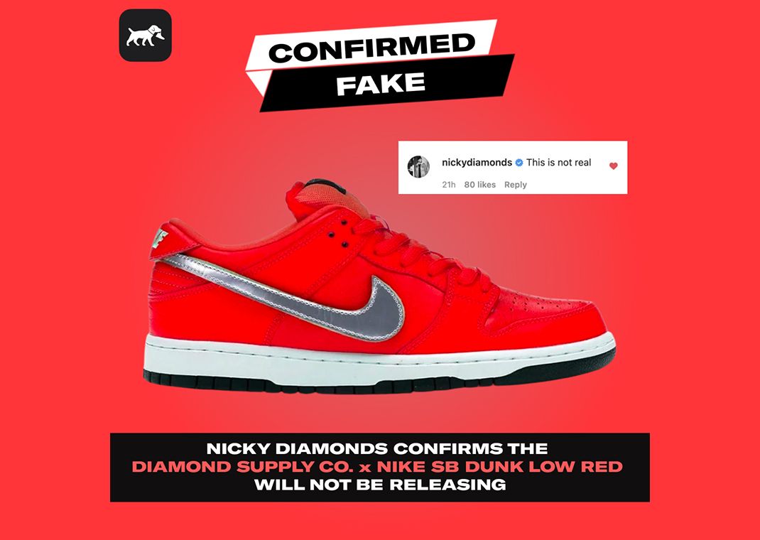 While this “first-to-post” culture leads to incidents like this, sometimes you can't even trust sources with the most authority. Nicky Diamonds in the past claimed that the Diamond Supply Co. x Nike SB Dunk High was not set for a release, though months later the pair made it to retail shelves. We may never see a red colorway make its way to the public, though this doesn’t mean a future collaboration with the two brands isn’t in development or planned for the future. For more breaking news in the sneaker and streetwear world, keep it locked to our Twitter and the Sole Retriever mobile app for real-time notifications on restocks, releases, and more.