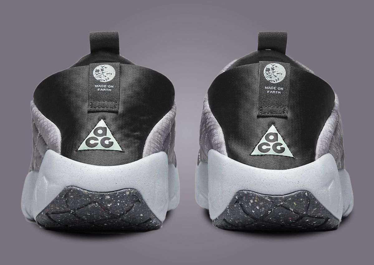 Covered in quilted nylon, the one-piece upper comes in a smokey, marbled-like pure platinum finish with white accent stitching creating a quilted appearance. Black leather around the mudguard adds reinforcement while the mini Nike Swoosh in green glow adds contrast to the neutral shades seen thus far. This same colorful pop makes an appearance on the pull tab’s “ACG” text while the heel features two more logos, “Made On Earth, and the triangular “ACG” logo, in this same hue. As for the heel itself, it comes in a black stretchy material that is collapsible, allowing for easy on-and-off wear. Underfoot, a foam midsole in pure platinum comes partially recycled as does the black Nike Grind rubber on the traction outsole.