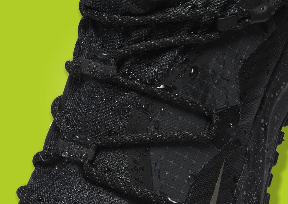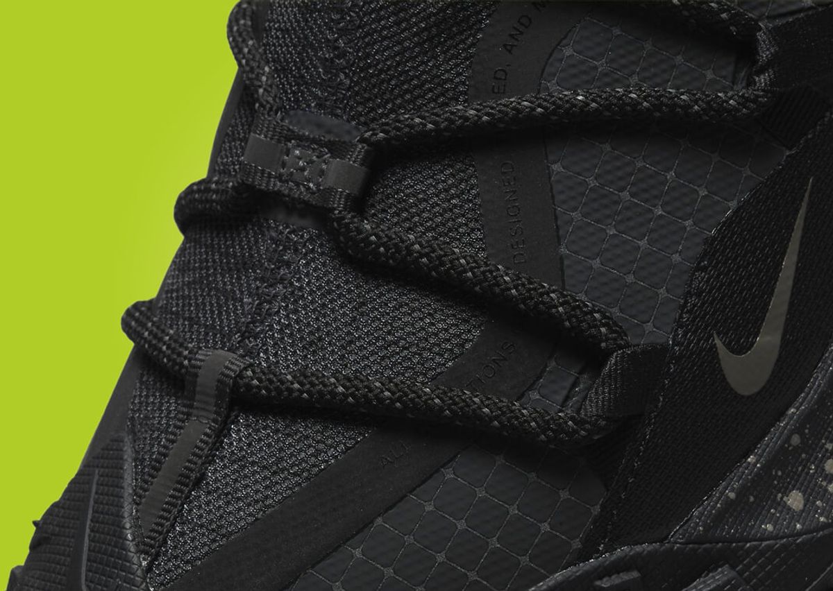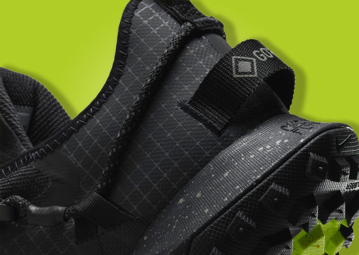 This version of the Mountain Fly Low features an all-black synthetic upper, including ripstop nylon and TPU, enhanced with Gore-Tex technology. A cinch-lacing system grants the wearer quick adjustments, with ACG branding adorning the tongue in volt green. Additional branding details include the ACG and Gore-Tex logos on the heel and Swoosh near the toe, all of which appear in a sleek grey hue. The midsole houses Nike's signature React cushioning in a speckled grey and white design. Completing the design is a lugged outsole that wraps up around the toe.