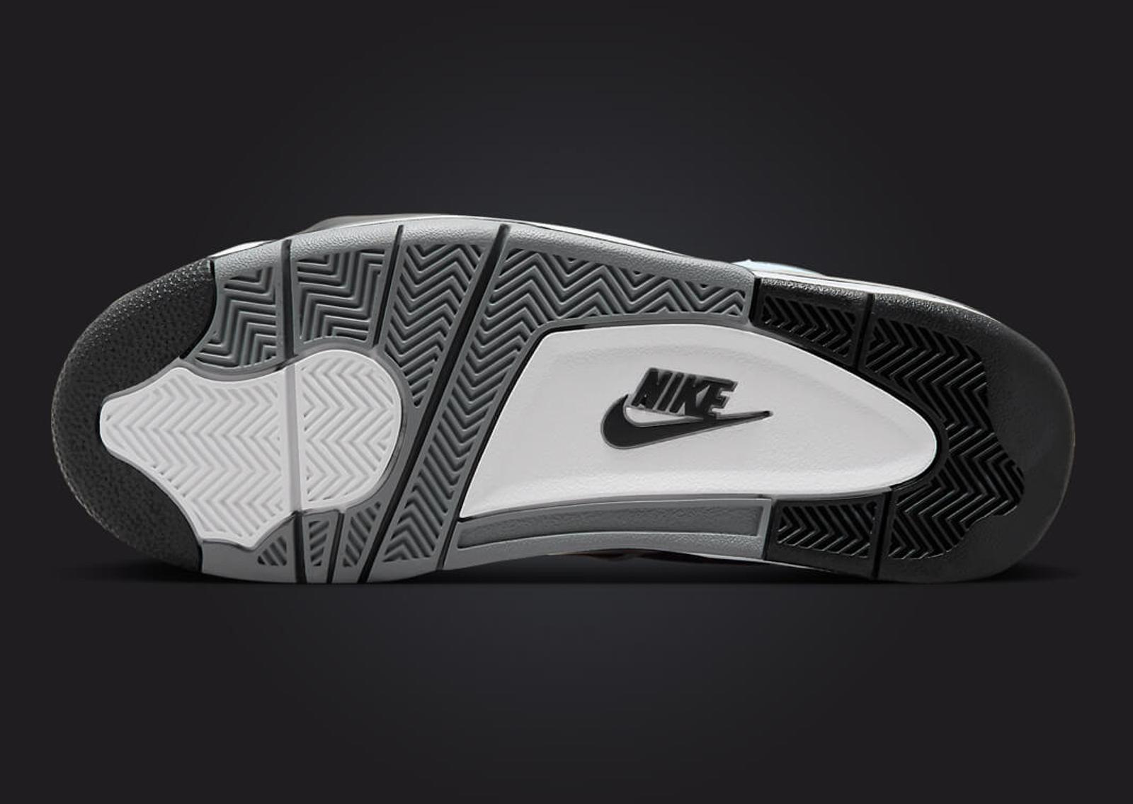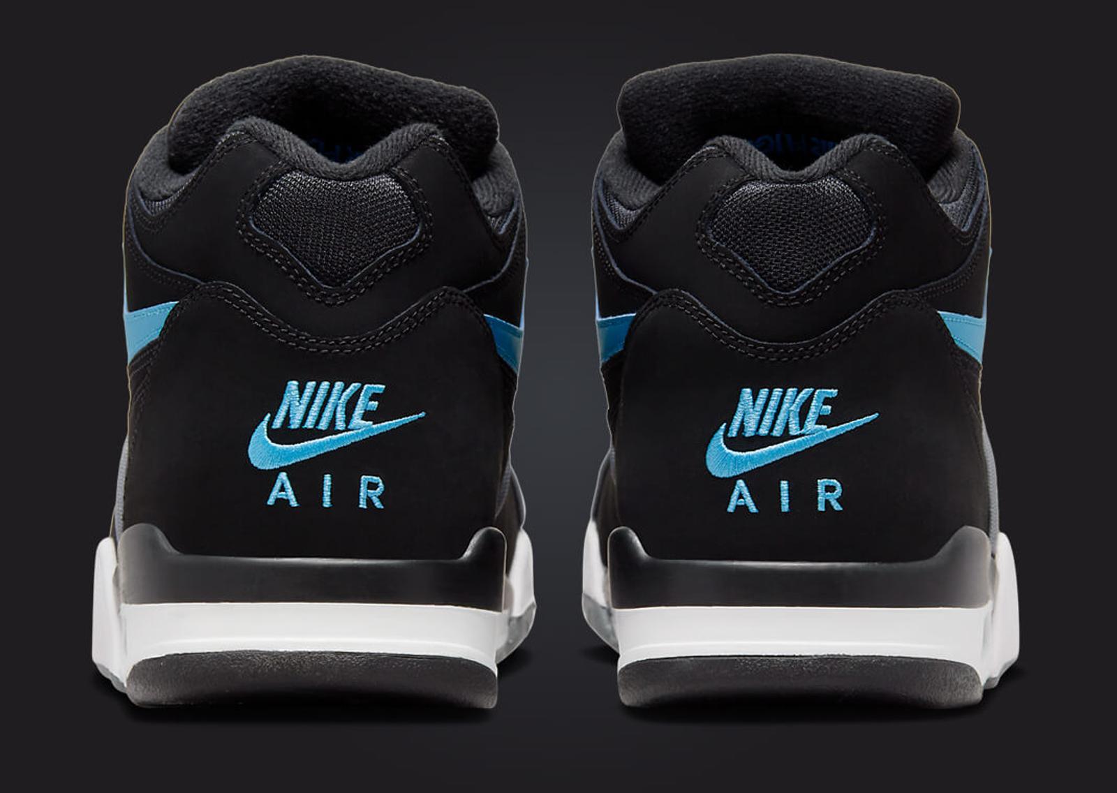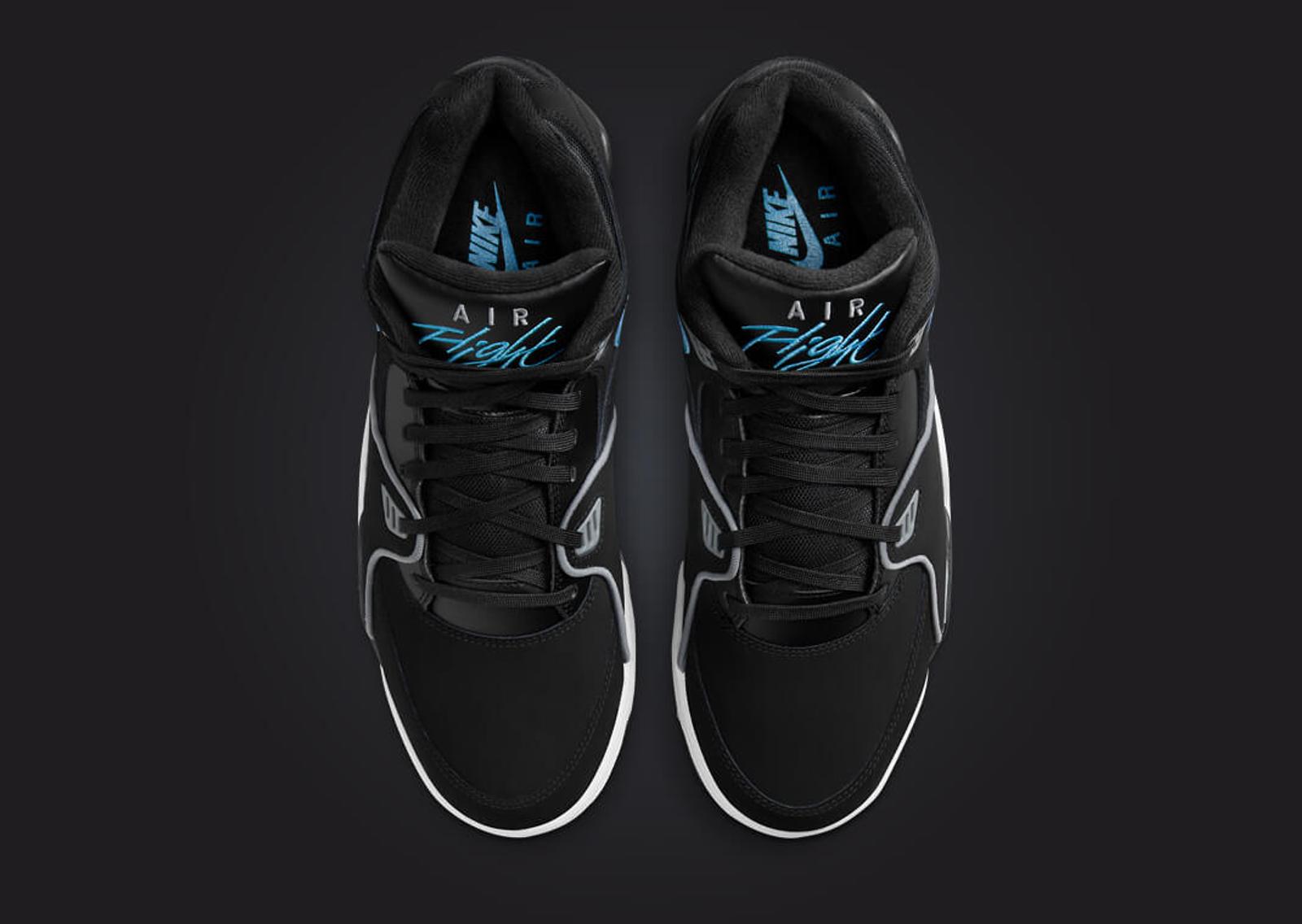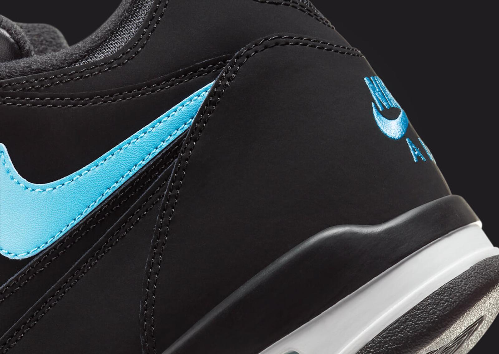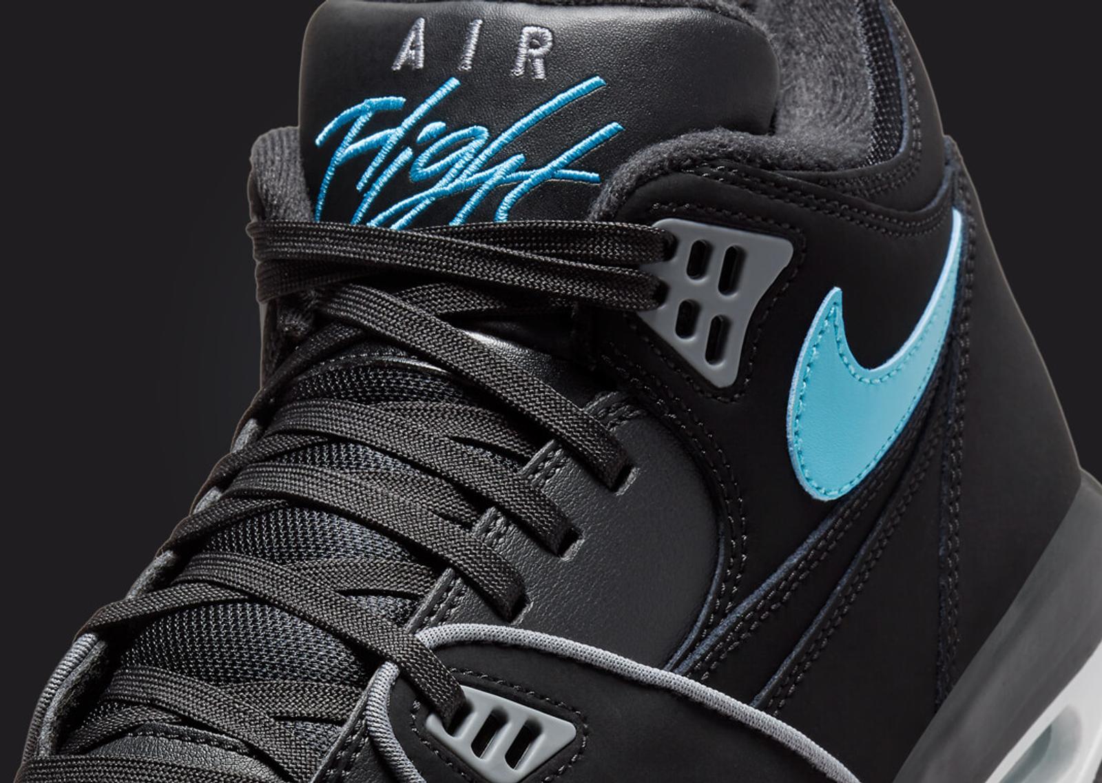 The Nike Air Flight 89 Black Noise Aqua's upper is all-black, mostly in nubuck, accented by smooth leather. The highlights, though, are easily the light smoke grey found on the piping, plastic eyelets, and Air branding on the tongue. But we must remember the star of the show, noise aqua. This bright shade of blue can be seen via the Swoosh on the sides, the Flight script embroidered on the tongue, and the Nike Air branding on the back heel and insoles. The midsole, borrowed from the Air Jordan 4, comes in black and white, with visible Air cushioning in the heel. A black and grey solid rubber outsole finishes things off.