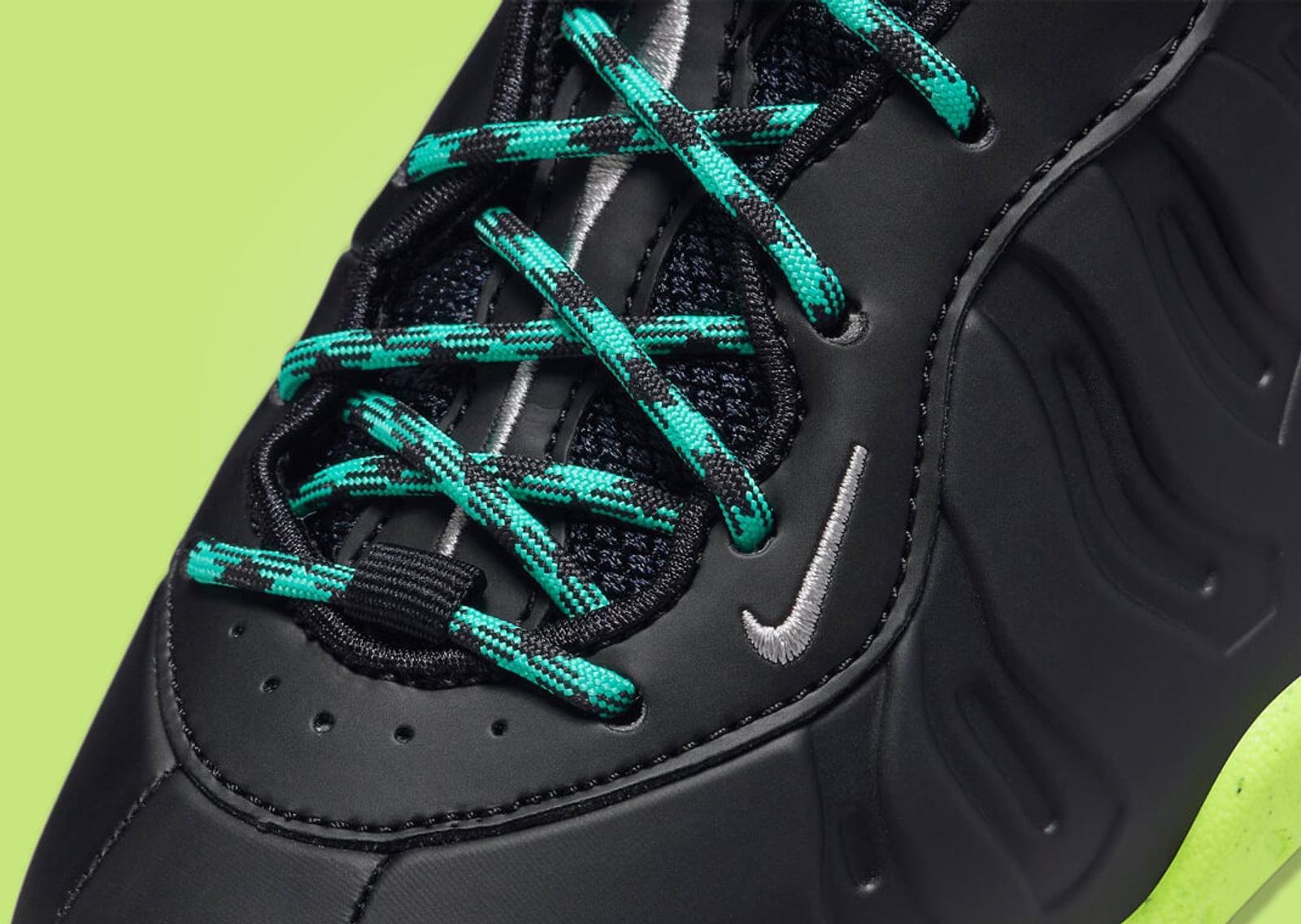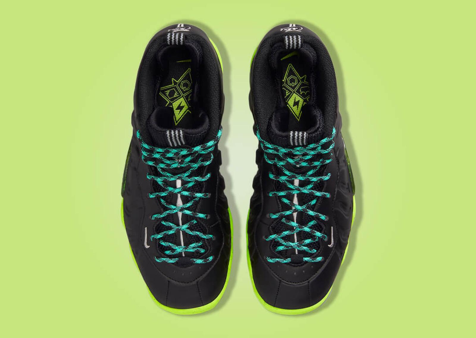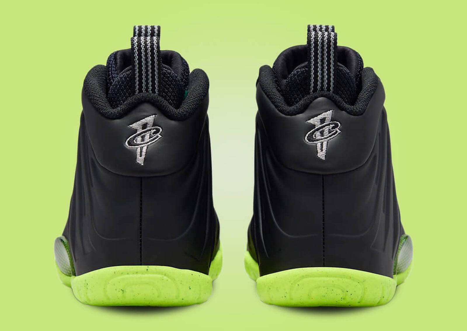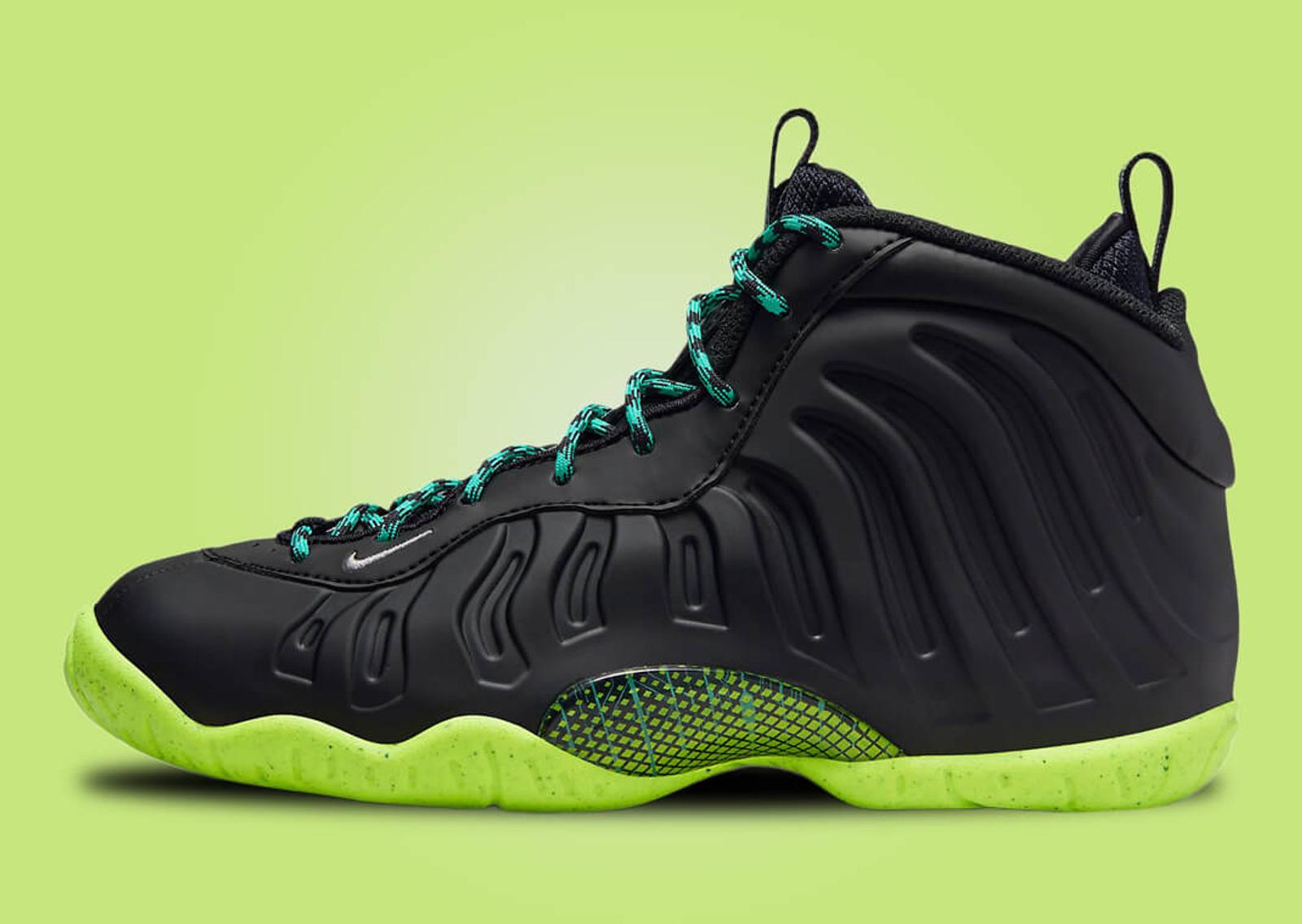 This kids'-exclusive version of the Foamposite carries forward the shoe's defining characteristics with its typical Foamposite upper and mesh interior. Primarily draped in a sleek black, the sneaker plays with color through subtle details. Aqua green appears on the lace set, providing a splash of color against the dominant black. White embroidery marks the mini Swoosh and nylon pull tabs, further enhancing the aesthetic. The insole showcases a graphic similar to those seen on the recent GS-exclusive Nike Ja 1 and Nike LeBron 20 colorways. This could signify the arrival of a more extensive collection specifically for kids. Down below, the sole unit sports a striking volt green finish, adding the final touch to this lively sneaker.