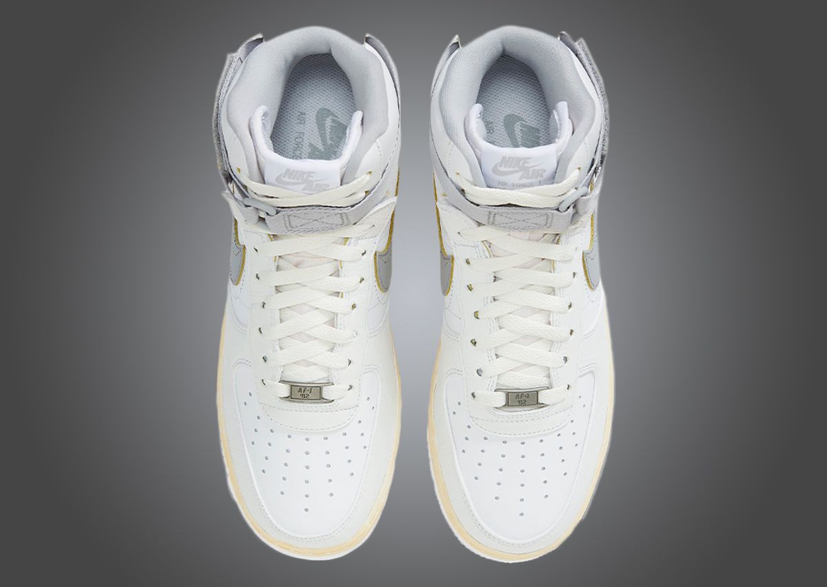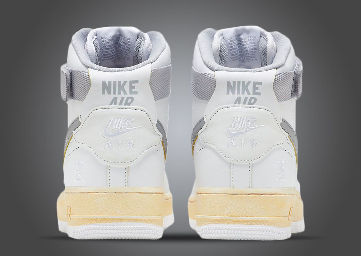 The Nike Air Force 1 High “Multi Layers” in white, neutral grey, sail, and coconut milk features grey Swoosh branding on the upper with a removable ankle strap. The smooth white leather of the upper features layers of stitching for both high-top and low-top Air Force 1s, including holes for stitching in the low-tops upper Swoosh on the sides and quarter panels. The notable detail is the layered “Nike Air” heel tabs, as one features the screen printed text logo while the second heel tab has a test logo stitched in. A heavily “yellowed” midsole sits over a clean, white outsole.