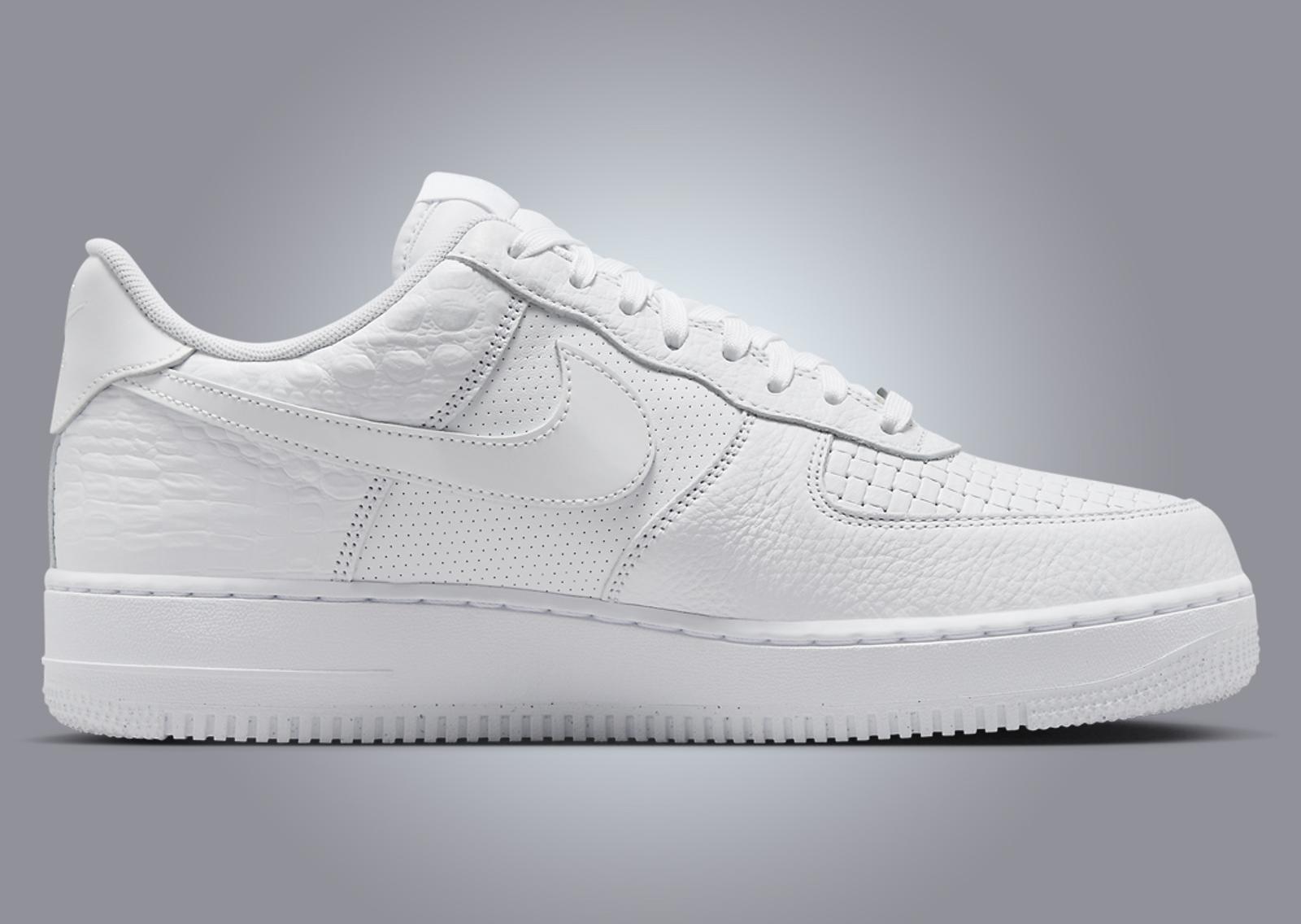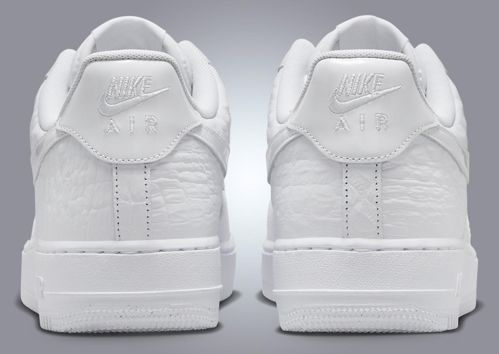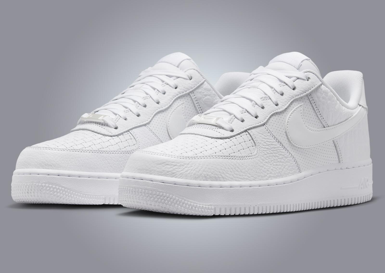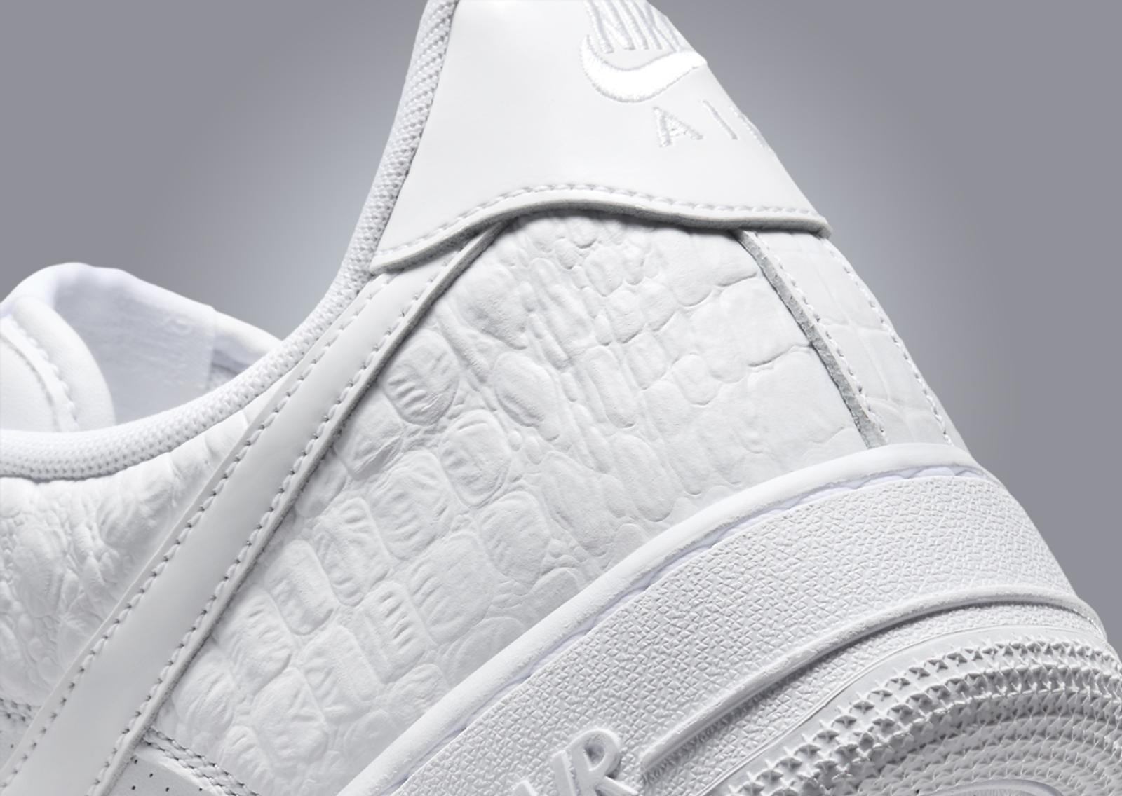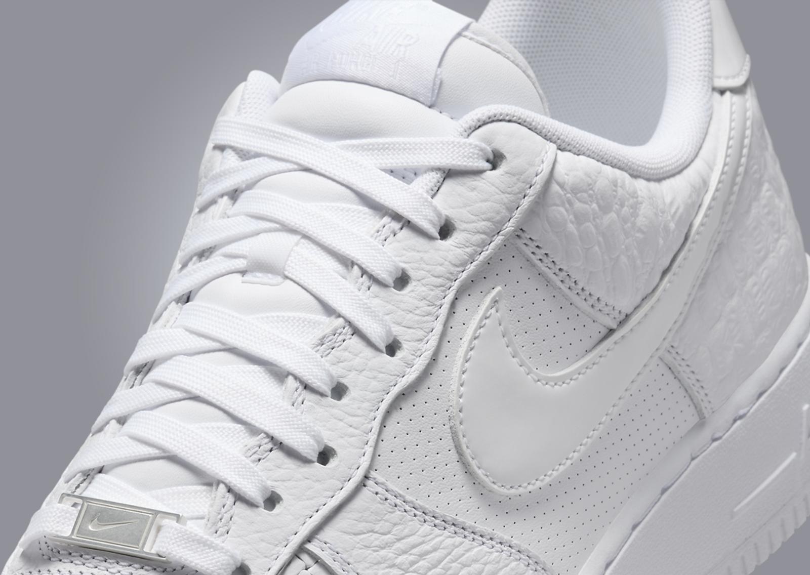 Seen here on the Nike Air Force 1 Low 3X Celebration are details and materials that have appeared on previous white AF1s, including the ultra-lux Italian Leather colorway from the 2000s, a faux croc skin pair from 2015, a patent leather colorway, and an all-perforated leather pair. We see tumbled leather details land on the mudguard and heel overlay, the latter taking on an exotic-like pattern, while the “woven” leather details from the Italian leather pair come placed on the toebox. Perforated leather is placed on the midfoot panel, while the Swoosh and heel tab come with patent leather details. Breaking up the all-white look is the silver Swoosh-laden lace dubrae. Finishing the design is the white-on-white rubber AF1 midsole and outsole.