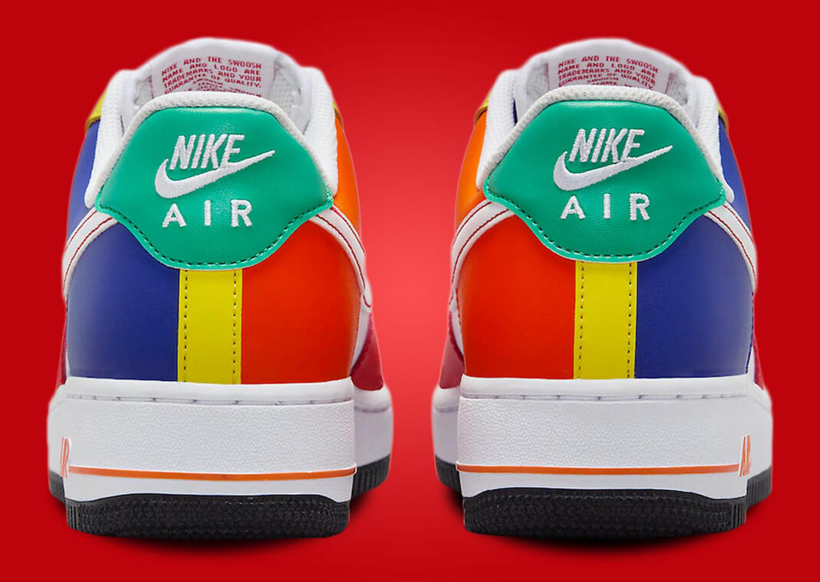 Although this iteration of the AF1 Low isn’t officially tied with the puzzle, the upper is covered with a vivid patchwork of colors similar to DJ Clark Kent's "The List" AF1. Red leather, reminiscent of one face of the Rubik's Cube, wraps around the mudguard and is contrasted by crisp white detailing on the toebox, quarter panel, and Swoosh. Bright yellow leather draws attention to the vamp and eyelets, while cool blue shades dominate the tongue and lateral heel overlay. On the medial side, we see orange take over the heel's leather panel. The heel tab dons a striking green, and the Air Force 1 branding on the tongue shares a red finish with the stitching on the Swoosh. A clean white midsole with orange 'AIR' branding on the heel rests atop a contrasting black outsole to complete this playful design.