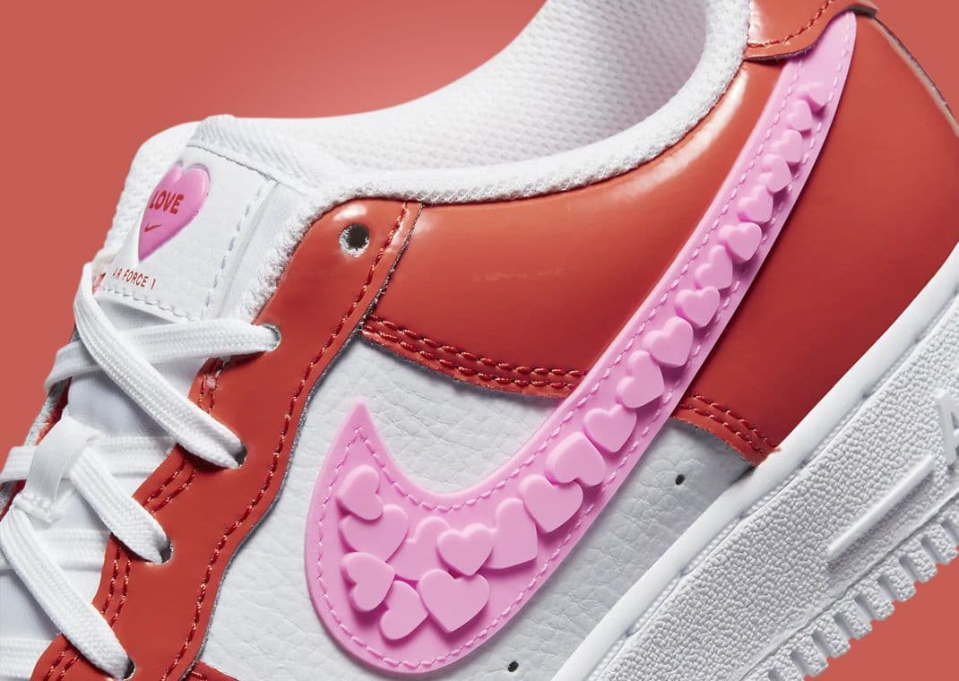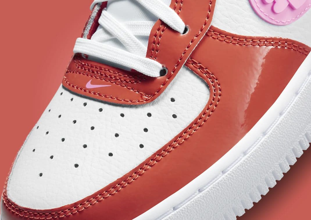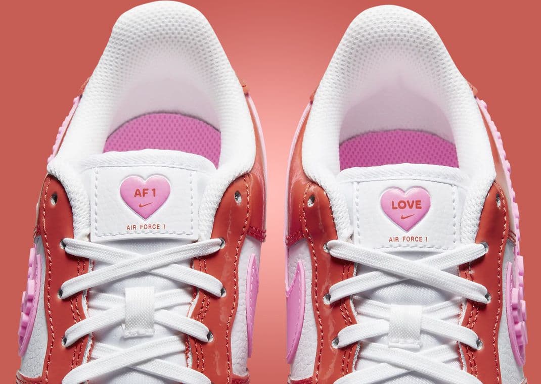 The silhouette, combining picante red, white, and pink spell shades, comes with tumbled white leather details on the toebox and midfoot panel. Patent leather in picante red appears on the overlays around the mudguard, eyestays, vamp, and heel overlay. Breaking up this two-tone look is the pink spell-shaded Swoosh on the midfoot, coming in a standard shape and design on the medial side but getting a makeover on the lateral. The logo is now laden with 3D heart details running throughout the entire Swoosh. More nods to the holiday of love are found on the tongue tag, redesigned to feature a pink heart in the center and the text AF1 on the right pair and Love on the left. Underfoot, the silhouette has a white AF1 midsole paired with a tonal rubber outsole.