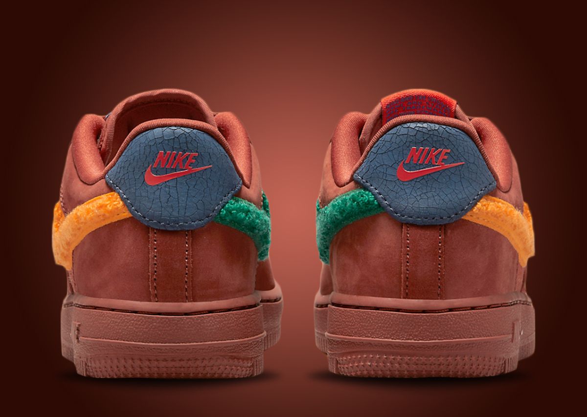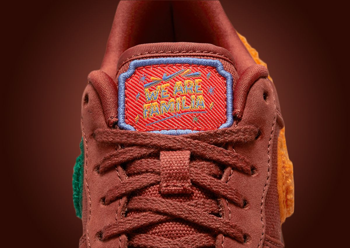 Coming in a tonal brown shade across the canvas and suede construction, the silhouette comes with mismatched colors on the chenille-covered Swoosh details. On the mudguard, eyestays, and heel overlay sits a suede that contrasts the canvas toebox, tongue, and midfoot panel. Tonal laces run up the tongue to a multi-color tongue tag that gets redesigned on the left shoe to include the phrase “We Are Familia,” also found printed atop the insoles. Around the midfoot, the Nike Swoosh comes in yellow chenille on the lateral side while the medial side comes in green, providing a pop of color amongst the sea of brown. Back on the heel tab, blue cracked leather is home to red Nike branding details. Rounding everything out is the brown-on-brown rubber midsole and outsole combo.
