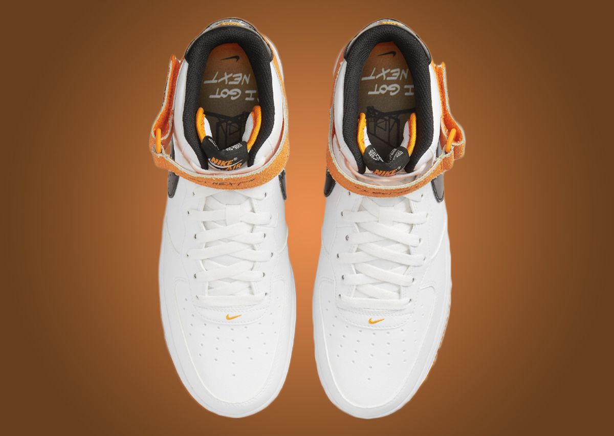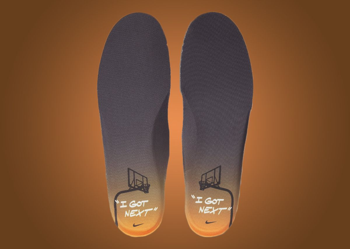 More orange details come in the form of the cracked leather heel overlay and “Nike” embroidery on the black patent leather heel tab. Internally, a black sockliner and orange tongue lining compliment the orange to black gradient insole that houses a basketball hoop graphic and the text “I Got Next.” Rounding out the look is the white midsole with black “Air” branding on the heel paired with an orange rubber outsole.
