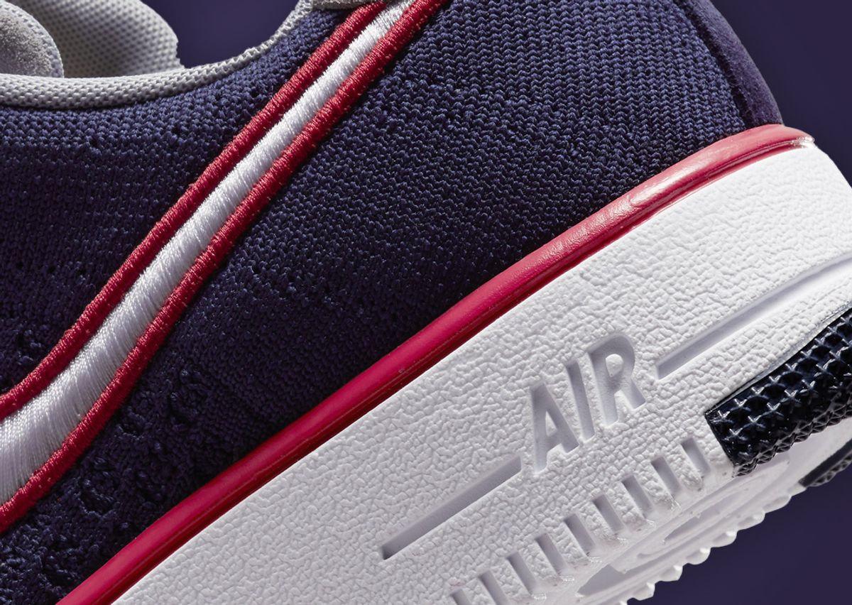 Unlike a traditional AF1, this Flyknit version utilizes just that, Flyknit, as its material of construction across the upper. Even with the switch to this textile material, details like the toebox and quarter panel are mimicked through a knit pattern that breaks up the look while Patriots-inspired colors and details land around the sneaker. Embroidered atop the college navy knit on the “vamp” is a set of six stars, representing the six Super Bowl victories in the franchise's history. Kraft himself gets a few nods with the lace dubrae and tongue tag featuring his initials “RKK” while the Patriots logo is located on the insole and back on the heel tab. Working along the midfoot is an embroidered Nike Swoosh that takes on the secondary colors of the team, red and white, while the mesh lining on the sockliner comes in grey. Finishing the upper are grey suede panels on the top of the tongue and back on the heel. The entire design is finished off through a rubber AF1 midsole and outsole combo that comes primarily in white with navy hits on the toe and heel.