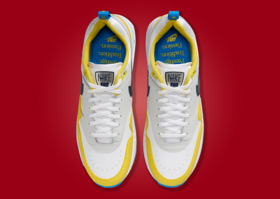 Across the aisle, the European Union-inspired pair showcases a color palette of yellow, navy, white, and grey. The glossy yellow mudguard stands out, beautifully complemented by a white base and grey overlays. The design elements pay homage to the EU, with stars circling the toebox reminiscent of the EU flag and a co-branded tongue tag featuring the EU flag next to a Nike logo. Yellow continues to dominate the sockliner, TPU eyelet, and the stars on the nylon pull tab at the heel. Grounding this pair is the iconic white midsole with a spikeless outsole in blue, navy, white, and yellow – perfect for any golf enthusiast.