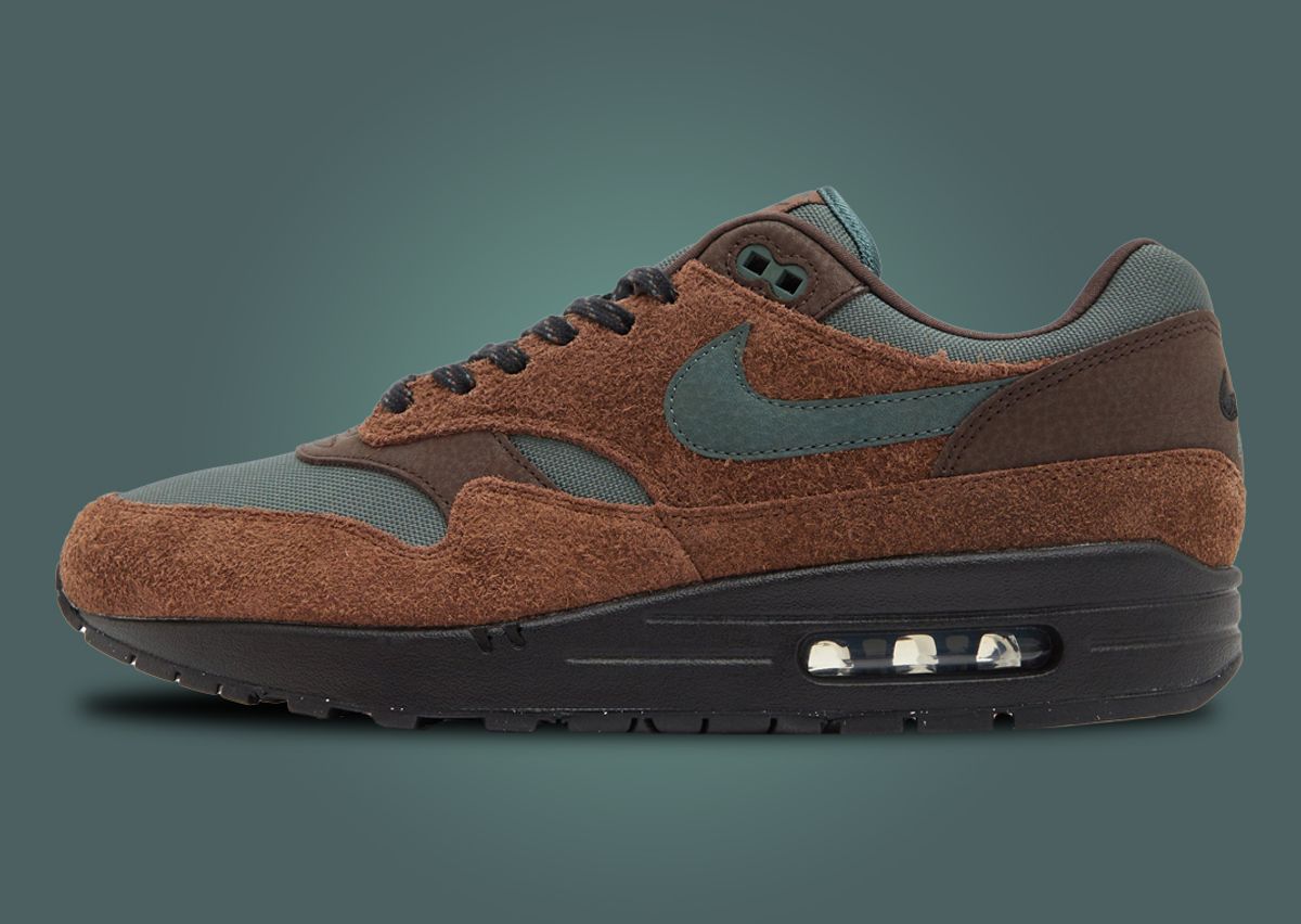 Embodying a fusion of diverse materials, the Nike Air Max 1 Beef & Broccoli is an enchanting blend of style and texture. The sneaker’s exterior showcases a rich brown hairy suede that spans across the mudguard and midfoot panel, providing a contrasting backdrop to the vamp and heel overlay that are decked in dark brown textured leather. An infusion of greenish-blue on the canvas base and the textured leather Swoosh further elevates the design. The heel area stands out with an embroidered black Swoosh hovering above the greenish-blue "AIR" text. Finalizing the design is a sleek, blacked-out Air Max 1 midsole complemented by a matching black rubber outsole.